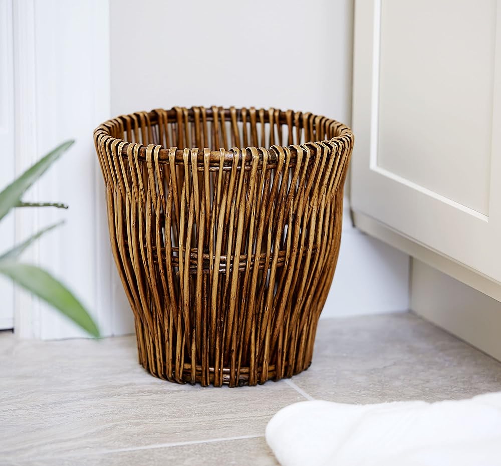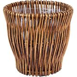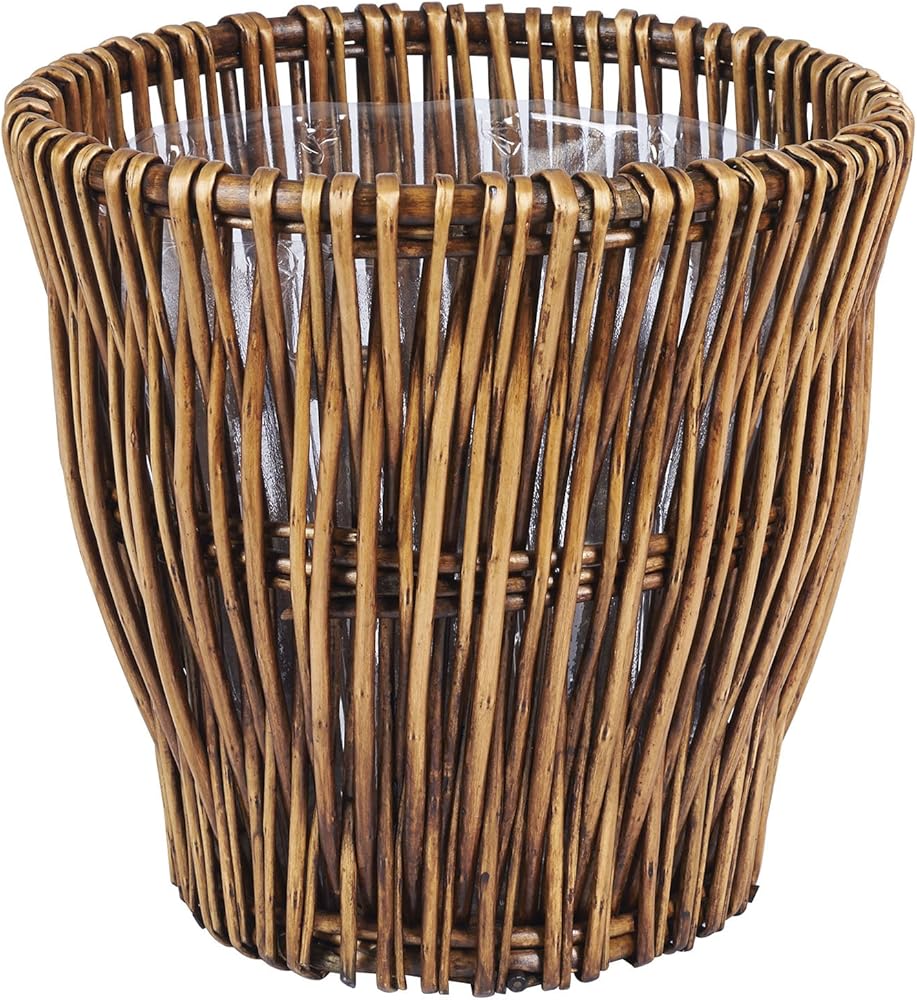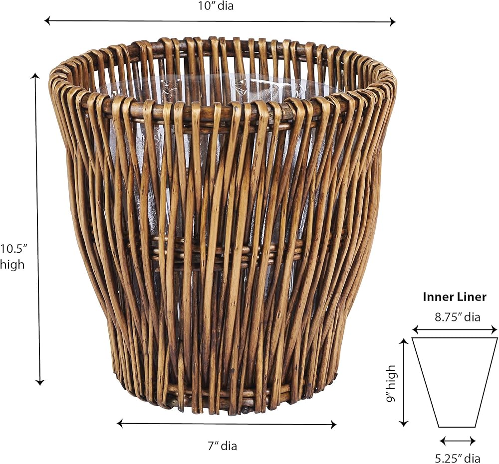 This small willow waste basket is a stylish addition to your home to help contain waste products in the bathroom, office, living room or bedroom. This item can also be used as a decorative planter for your indoor potted plants or a small storage bin for yarn, magazines, newspapers and other items. Made of an eye-catching willow weave, this waste basket is a great alternative to metal or plastic cans. The basket is handmade and stained to a lovely, rich brown. The wicker is woven into an attractive pattern and makes a wonderful addition to the decor of any room. Due to the handmade quality, the color and size of this item may vary slightly, adding to the unique quality of this piece. A removable liner is attached below the top edge of the basket. The liner can be removed to be washed and sanitized for added cleanliness. This reusable liner not only promotes a clean environment, but also decreases plastic bag use. These qualities make this waste basket functional, attractive and environmentally friendly. This willow reed waste basket is a wonderful way to introduce a bit of natural flair and environmentally friendly features to your home. Created out of high-quality materials with a smart design, this waste basket easily combines convenience with durability.