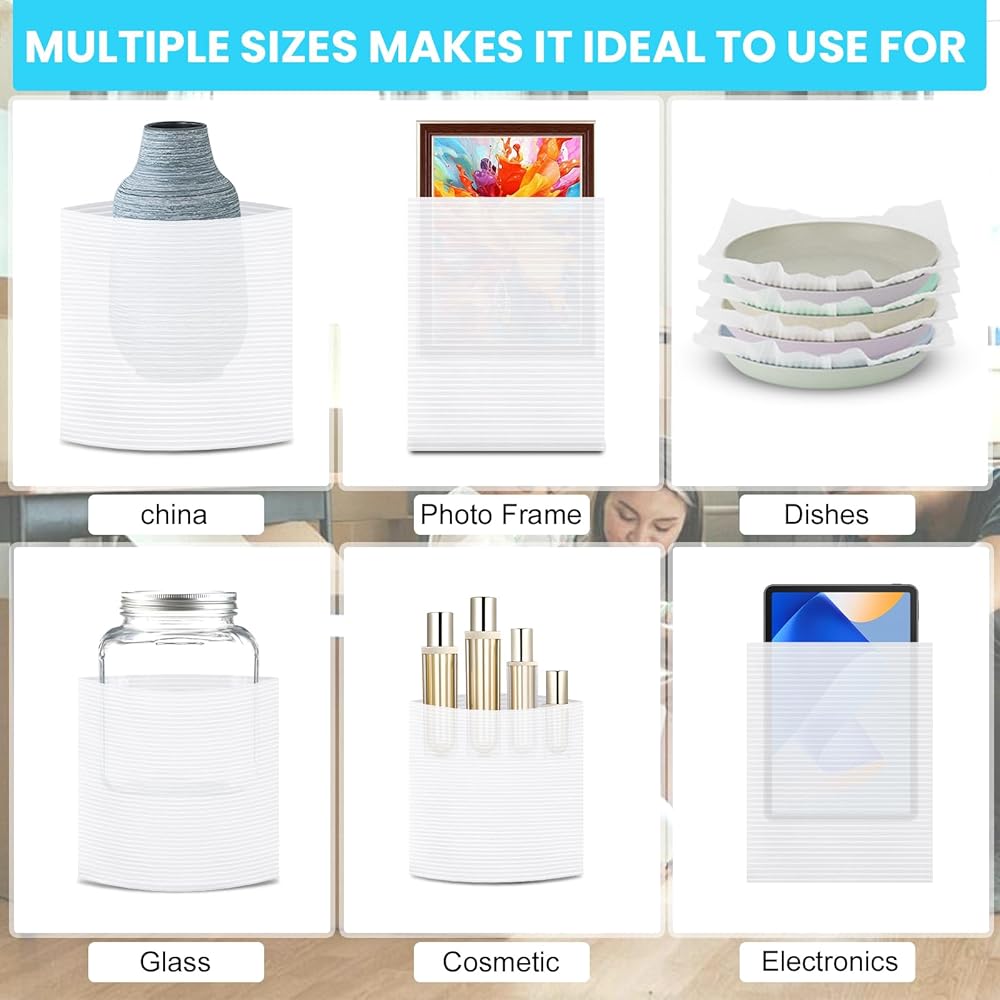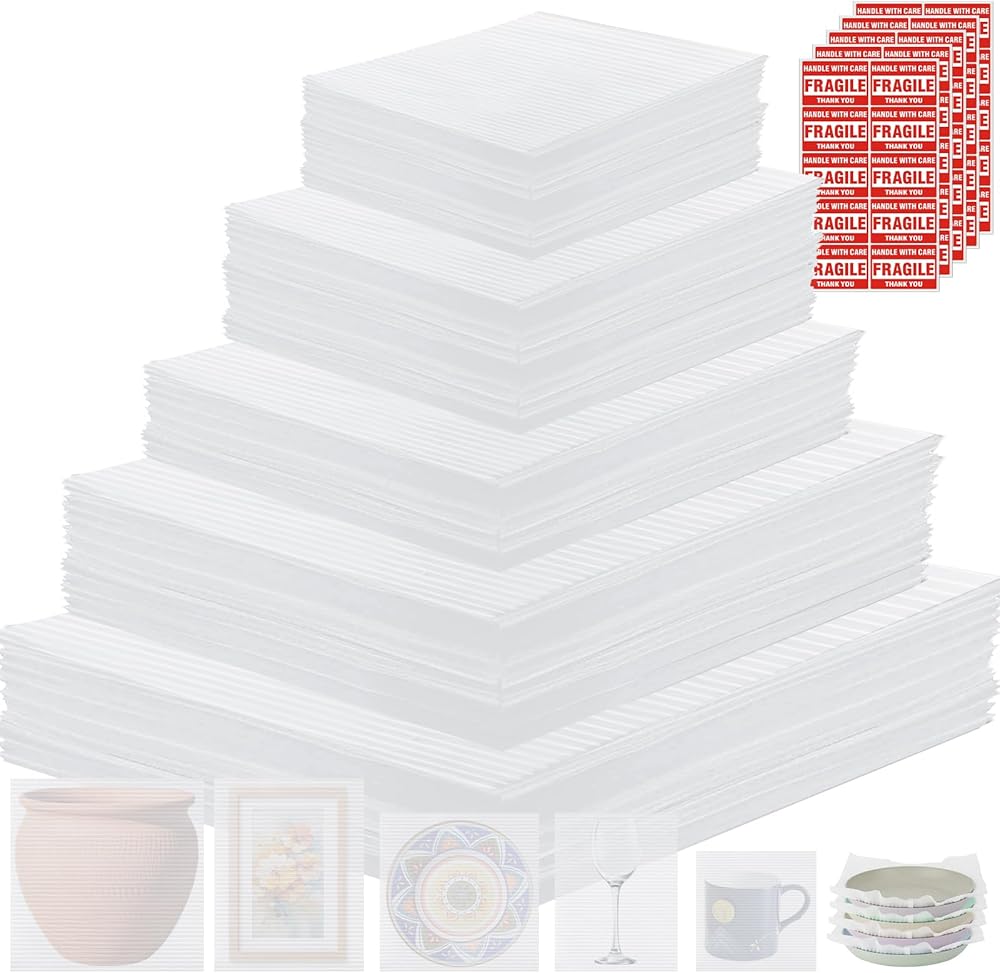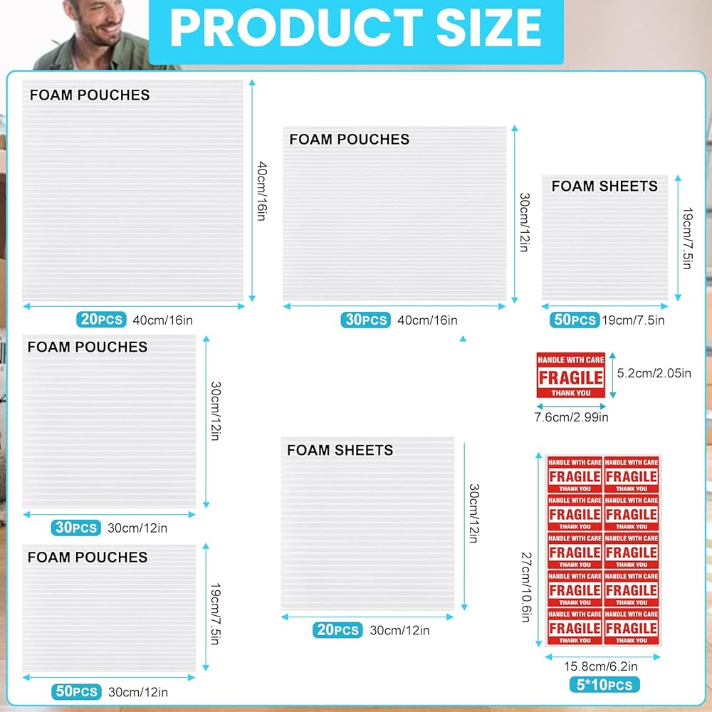 【7 Different Sizes of Foam Sheets & Foam Pouches】You will get 100 packs of cushion foam pouch and 150 packs of foam sheets and 50 fragile labels.There are a total of 100 foam pouches in 4 different sizes, including 25pcs (10" x 10") foam pouches, 25pcs (8" x 12") foam pouches , 25pcs(6" x 12") foam pouches and 25pcs(7.5" x 7.5") foam pouches. And there are a total of 150 foam sheets in 3 different sizes, including 50pcs(16" x 16") foam sheets, 50pcs(14" x 12") foam sheets and 50pcs(12" x 12") foam sheets. Suitable for small and fragile items in our daily life, such as glasses, cups, dishes, small photo frames.