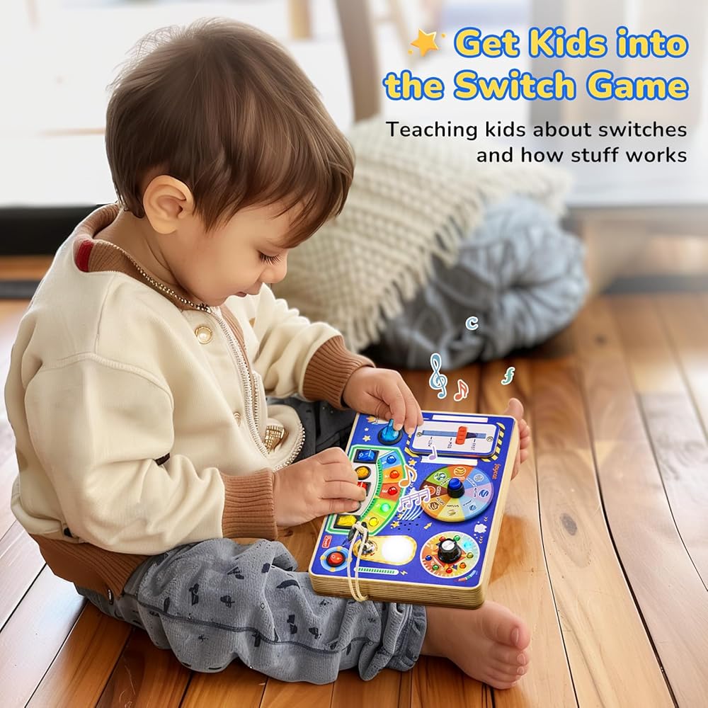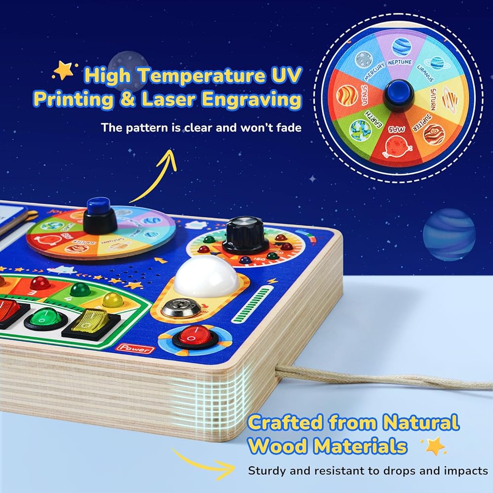 Interactive Wooden Switch Board: Designed for toddlers who love switches and LED lights, this toddler busy board features different switches, each linked to a unique LED. The brightness is perfectly adjusted to be comfortable for young eyes, not too bright or dim