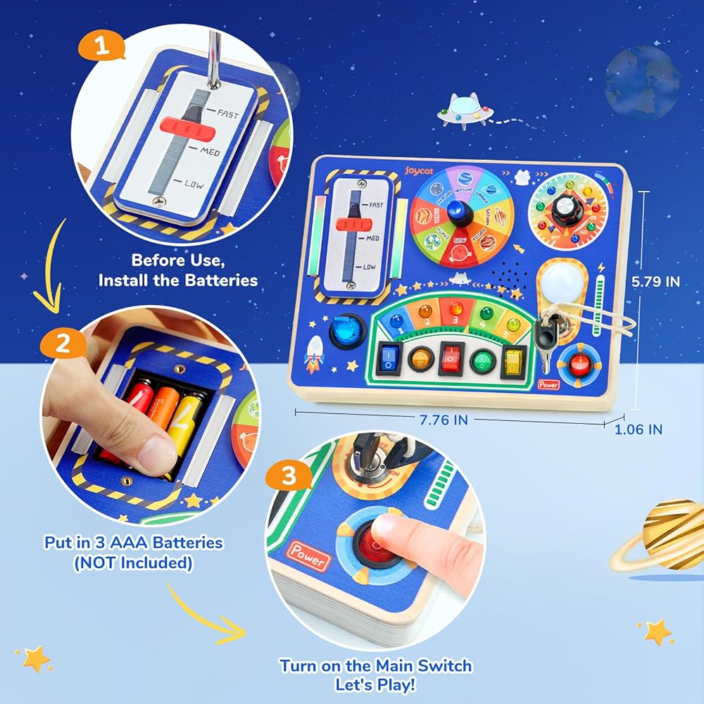 What Sets Our Busy Board Apart is its unique spin dial feature and a selection of 5 beloved nursery rhymes. Catering to children's auditory, tactile, and visual development, it goes beyond conventional switch and light designs. Before use, please install 3 AAA batteries NOT Included, the battery compartments are easy and safe for parents to access and replace the battery
