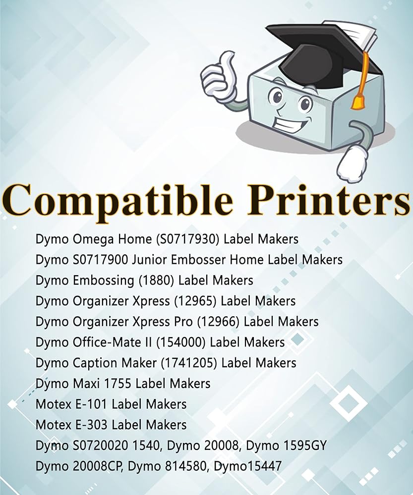 Printer Compatibility: Dymo Office Mate II 1540, DYMO Organizer Xpress 12965, Dymo Organizer Xpress Pro 12966, 1550 1595 and 1570 label maker, Dymo Compact Embosser,Dymo Embossing Label Makers 1610 , MoTEX E101/E202/E303, Embossing machine and so on.