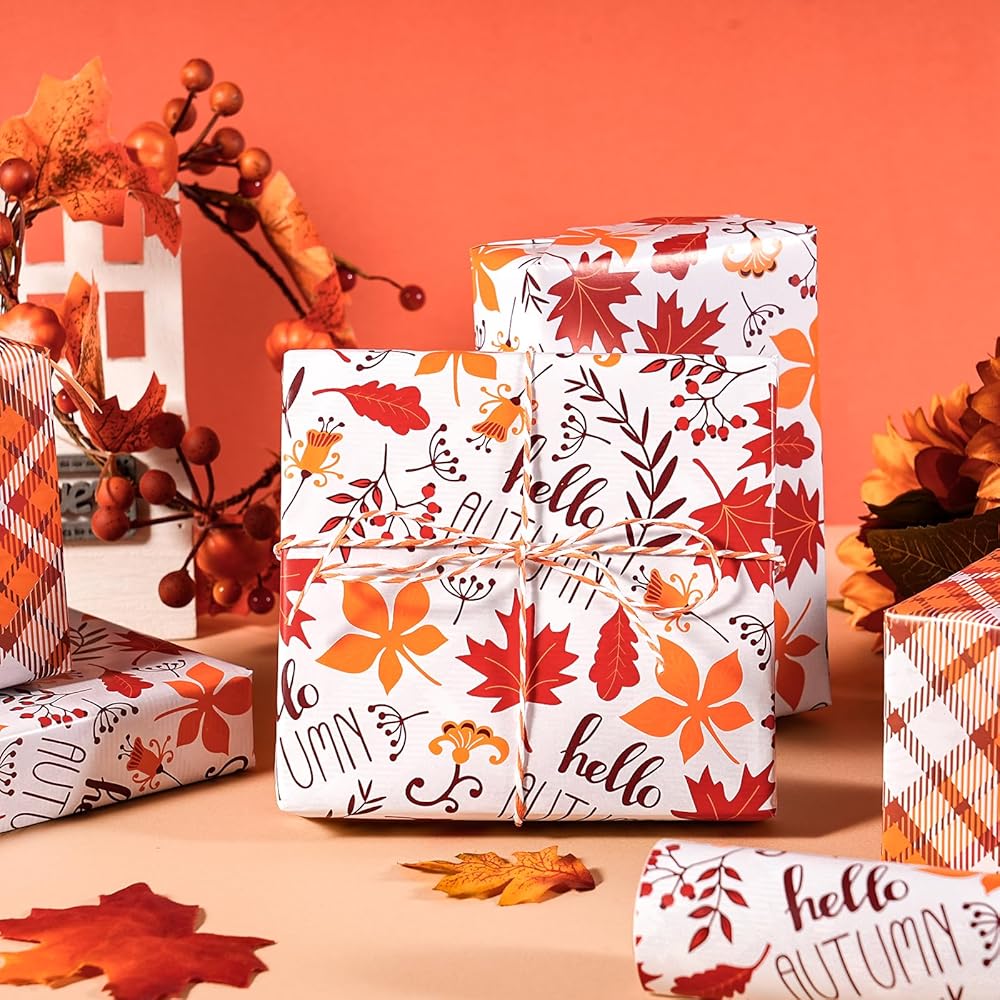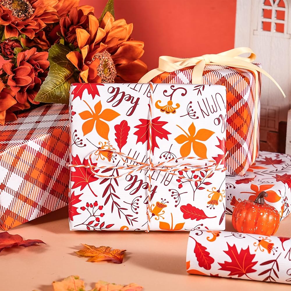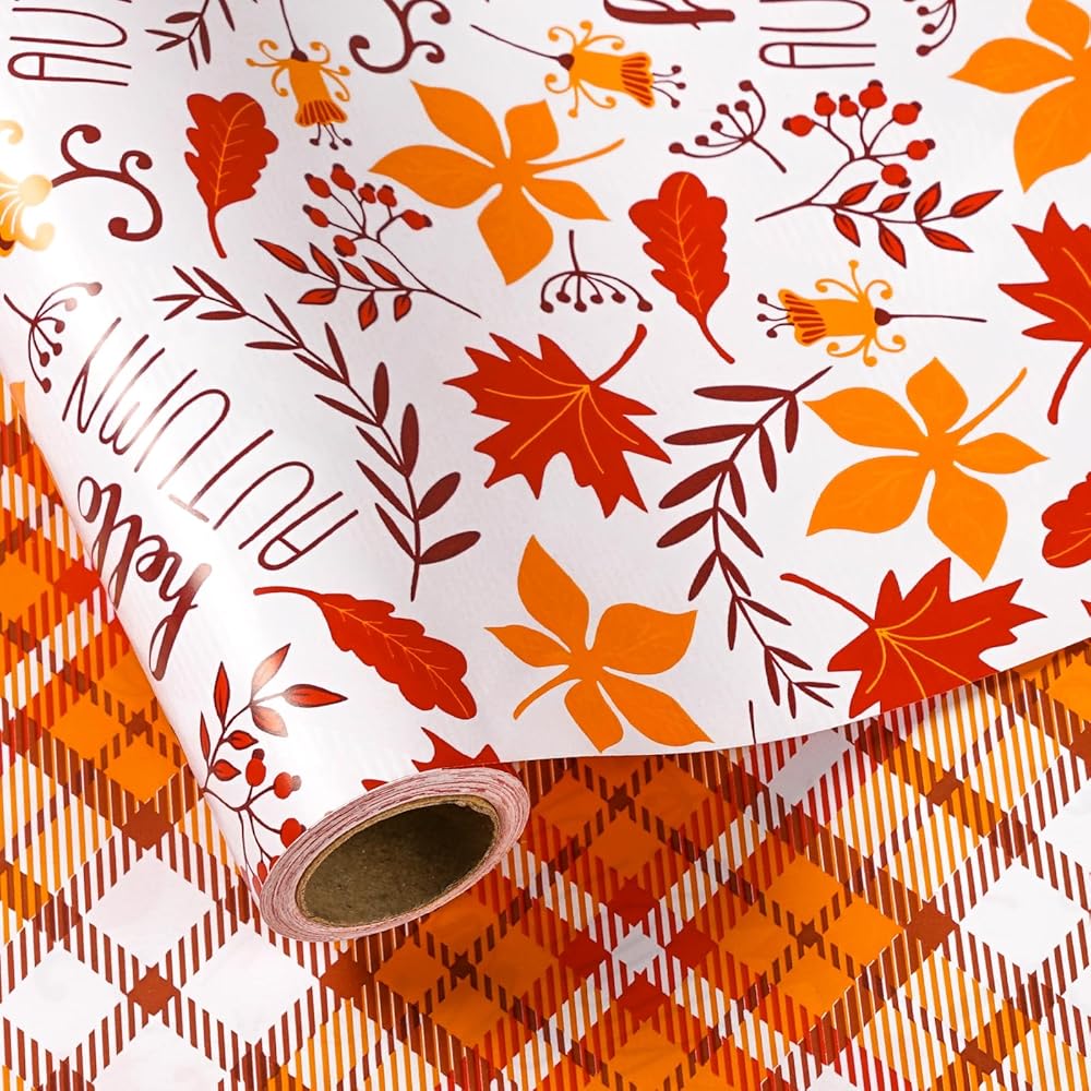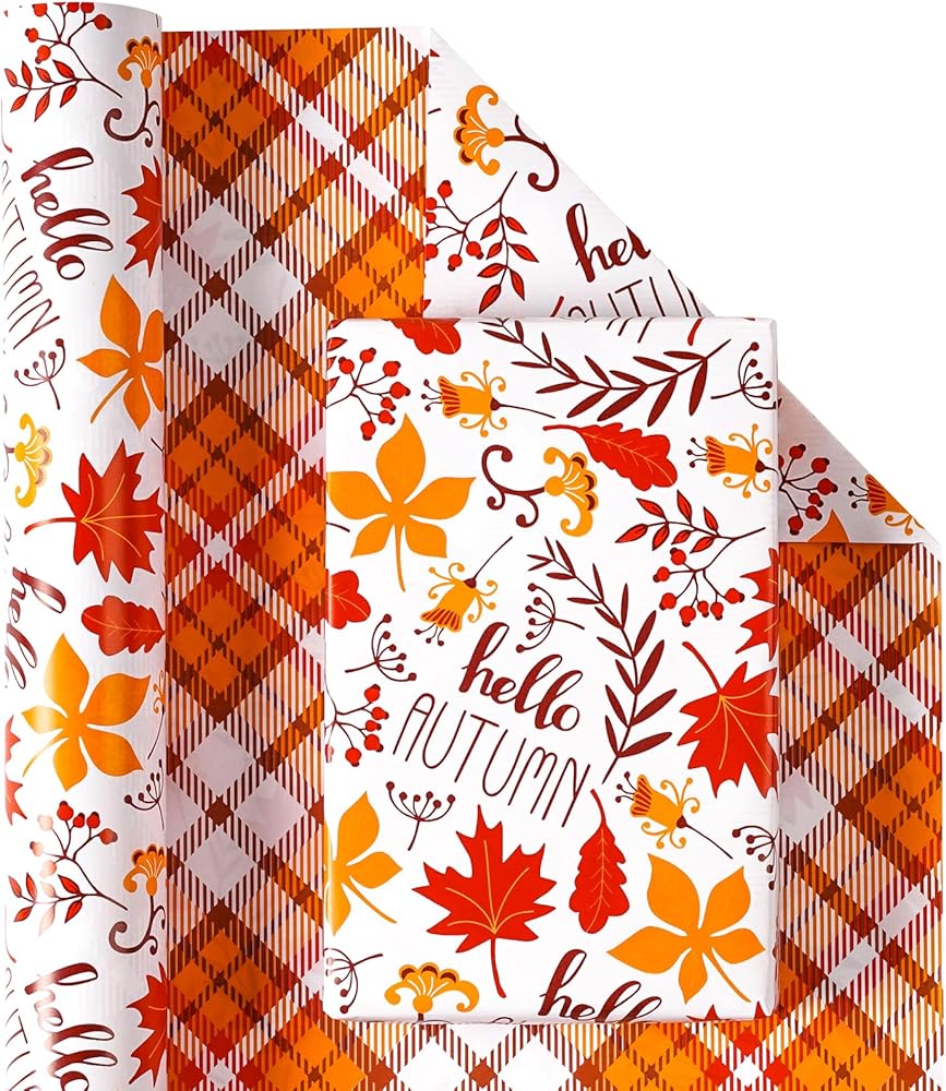 LeZakaa Fall Reversible Wrapping Paper Roll, Maple Leaf with Hello Autumn Chestnut & Classic Plaid Print for Autumn, Thanksgiving Gift Wrap, DIY Craft, Mini Roll, 17 inches x 32.8 Feet (46.45 sq.ft.)