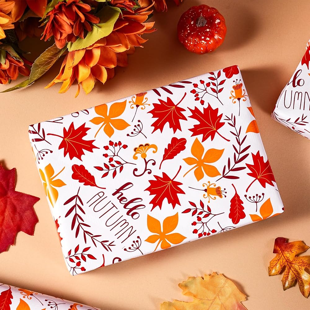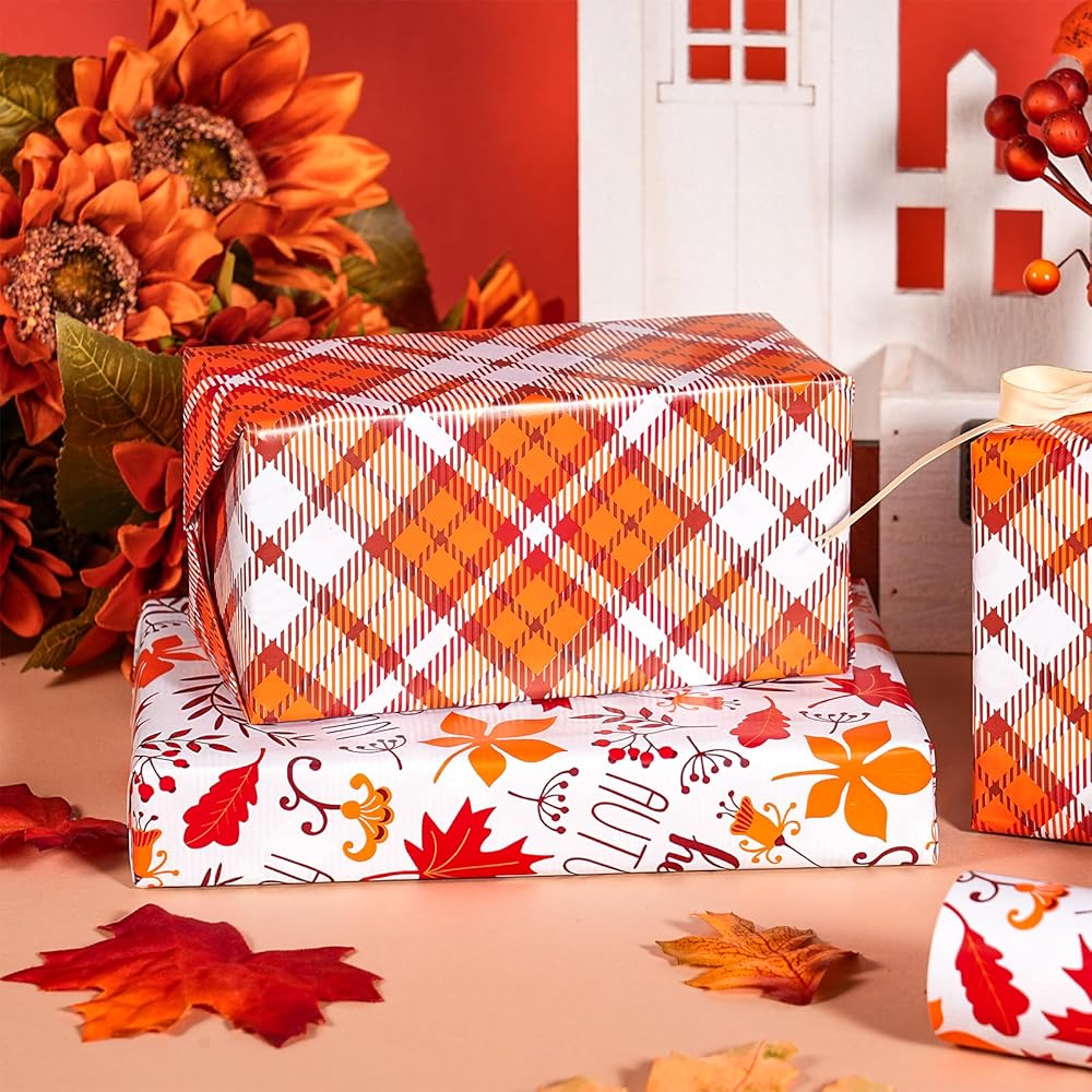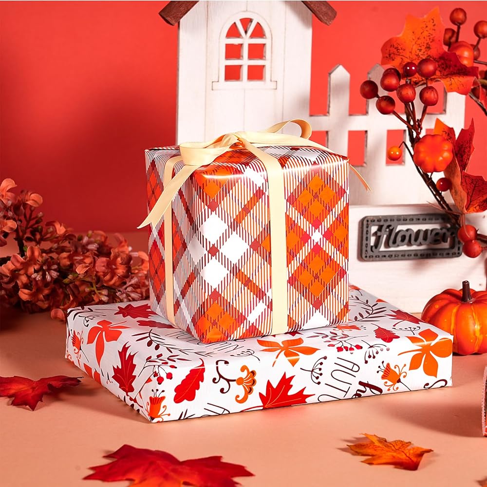 LeZakaa Fall Reversible Wrapping Paper Roll, Maple Leaf with Hello Autumn Chestnut & Classic Plaid Print for Autumn, Thanksgiving Gift Wrap, DIY Craft, Mini Roll, 17 inches x 32.8 Feet (46.45 sq.ft.)
