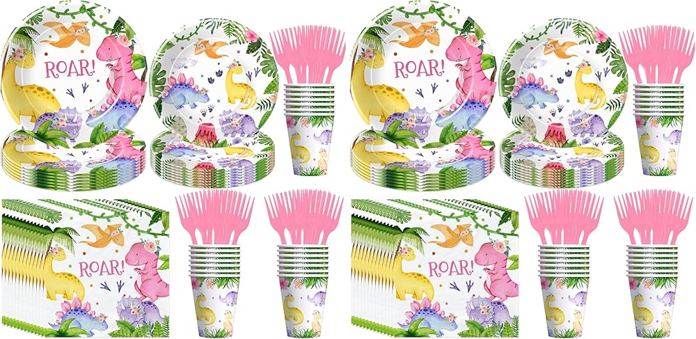 【Complete Set】Our girl dinosaur birthday party decorations tableware sets come complete with all the essentials for a seamless party experience including 24pcs 9'' dinosaur plates, 24pcs 7'' dino party plates, 24pcs paper napkins, 24pcs paper cups, 24set disposable forks, for dino party decorations & dinosaur baby shower supplies