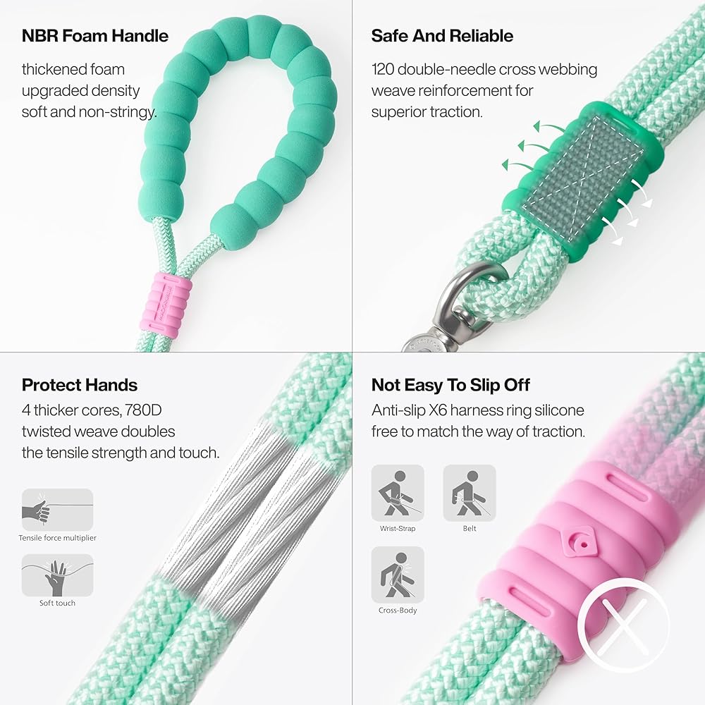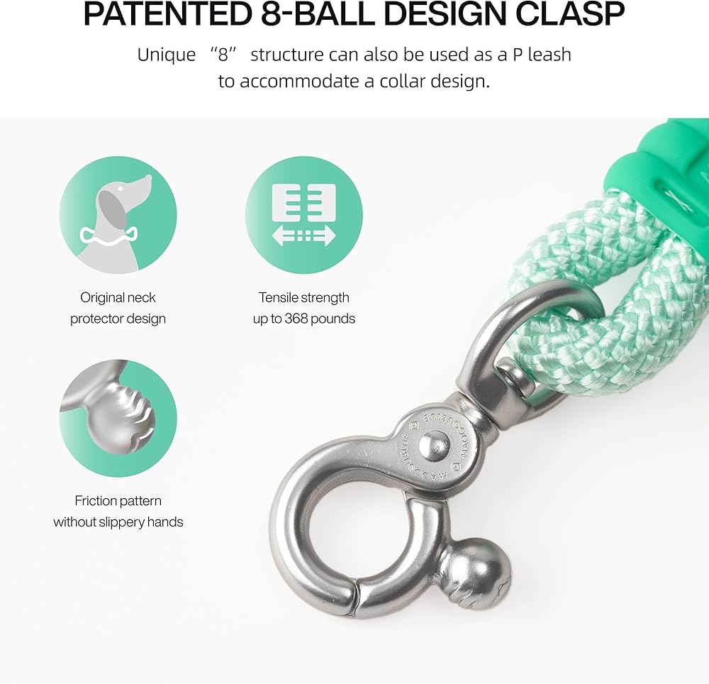 【Patented 8-Ball Design Clasp】The clasp is made of zinc alloy with good gloss, corrosion resistance and structural stability.360° rotating clasp is flexible, no more tangles and knots, perfect for enjoying a relaxing walk or energizing workout with your dog. The unique “8” structure can also be used as a P leash to accommodate a collar design. The ball-shaped design of the closure protects your pet from scratches from the buckle.tensile force up to 200KGF. this leash ensures a safe and enjoyable experience for both you and your furry friend.
