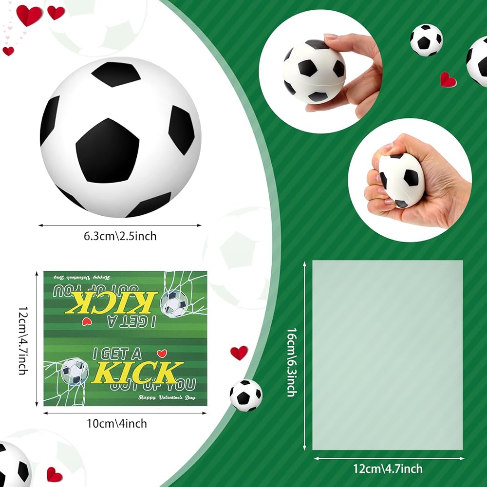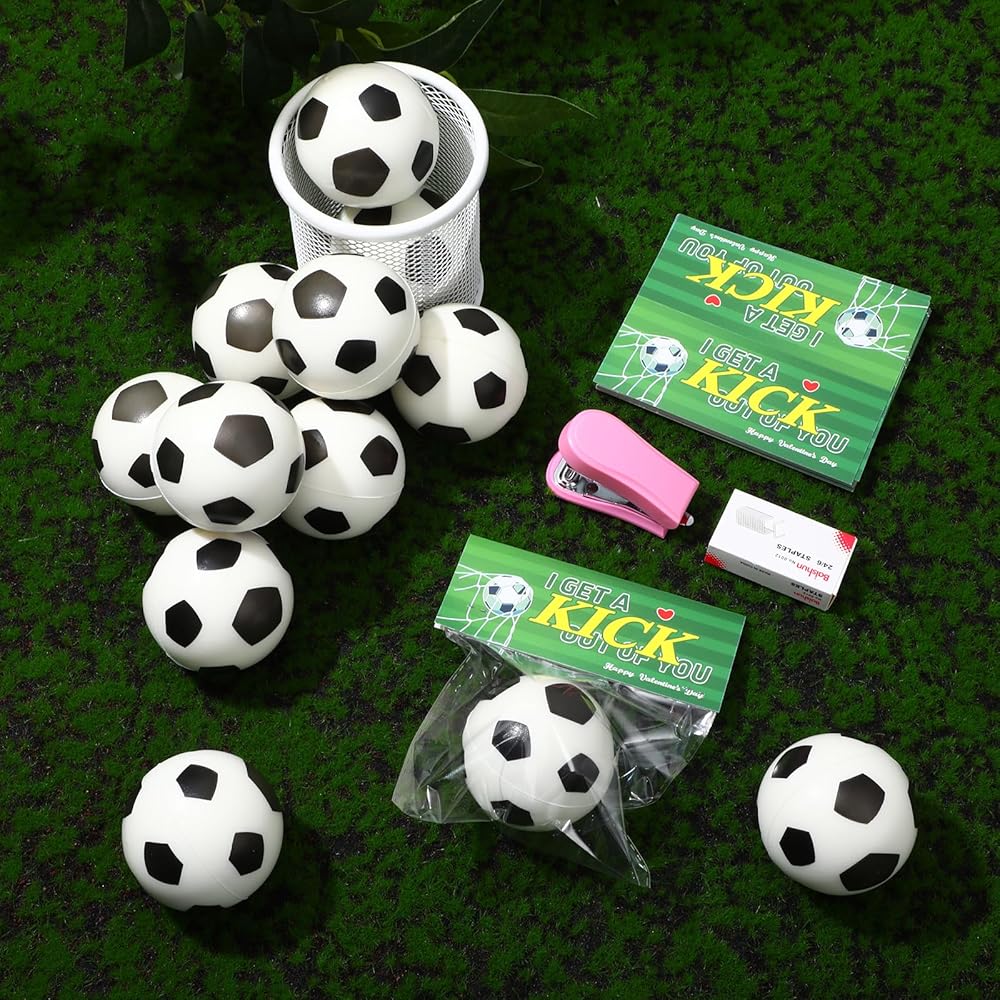 Step into the realm of fun and stress relief with our Valentine's Day sports themed party favors. Designed for maximum enjoyment, this package consists of 24 mini balls, 24 headers, 100 clear packaging bags, and 1 stapler and staple set. The thoughtfully sized 2.48 inches diameter of the mini balls fits in small hands for comfortable play or stress relief.