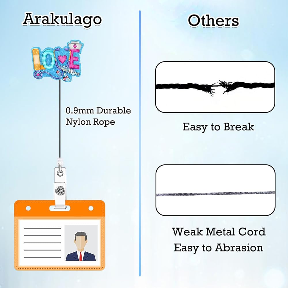 [lightweight & Sturdy Nurse Badge Reels] Arakulago Nurse badge reels are crafted from durable materials like acrylic and metal, featuring lightweight, waterproof, and heat-resistant properties. They come with a sturdy alligator clip that securely holds your ID, ensuring it never drops, perfect for nurses and other professionals.