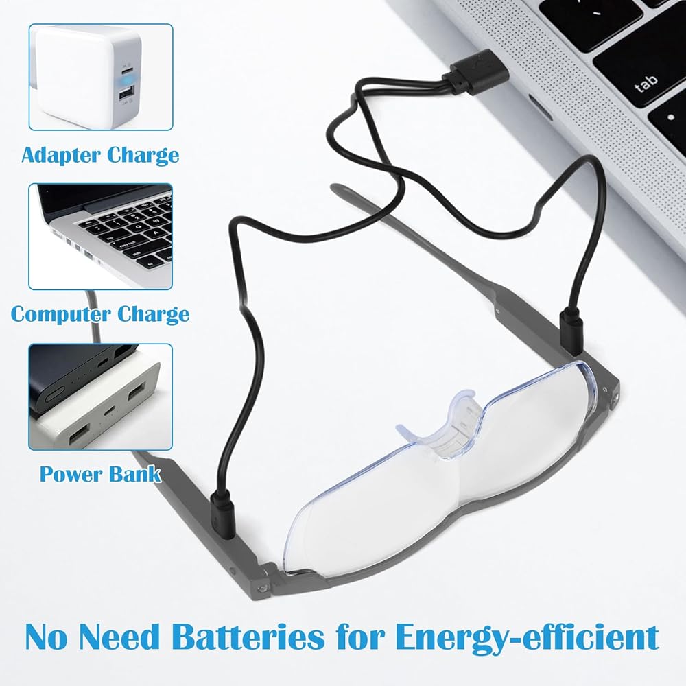 [USB High-efficiency Rechargeable Battery] The magnifying glasses can be powered up with the included charging cable. You no longer need to buy batteries, which reduces weight and saves money and energy. Charging is quick and easy, and the glasses can be fully charged in just 1.5 hours.
