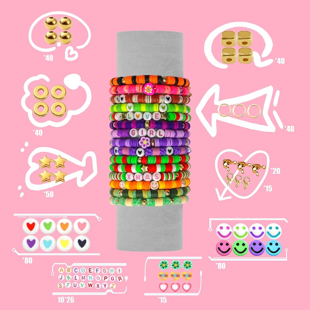 [Bracelet Making Kit] Bead kit contains what you need: about 4800 polymer clay flat beads and 480 accessories kit (including a full set of a - z letter beads and smiley face beads, polymer flower beads, spacer beads, spacer beads, pendants, flip clips, lobster clasps, earrings, earring danglers, etc.), 1 roll of 8m elastic cord, 1 pair of plastic tweezers to meet all your bracelet making and jewelry needs.