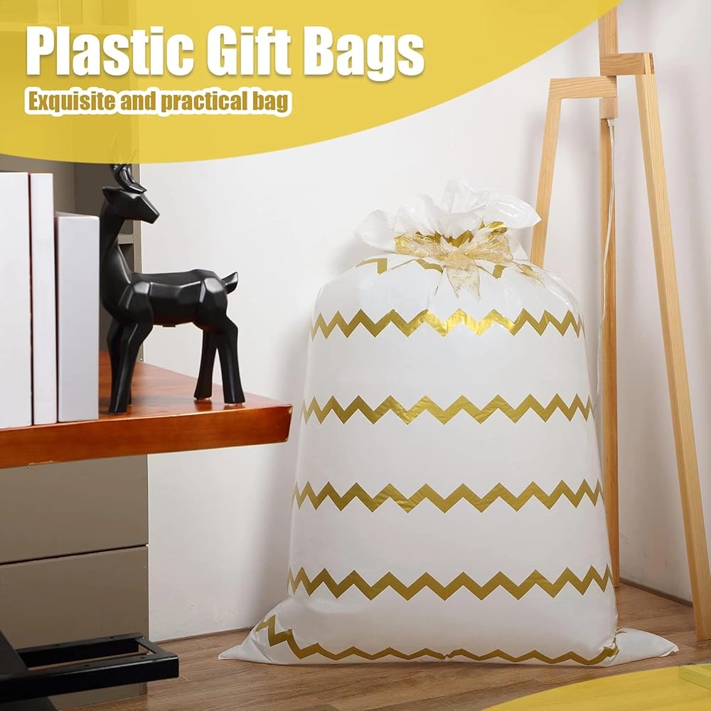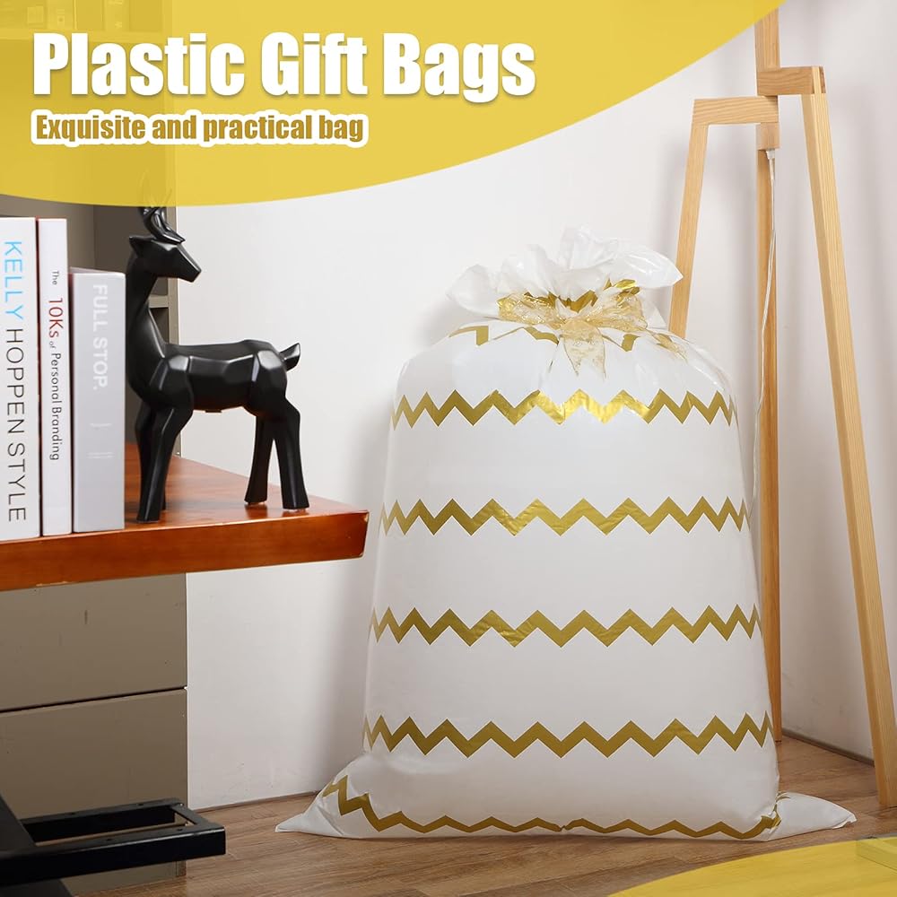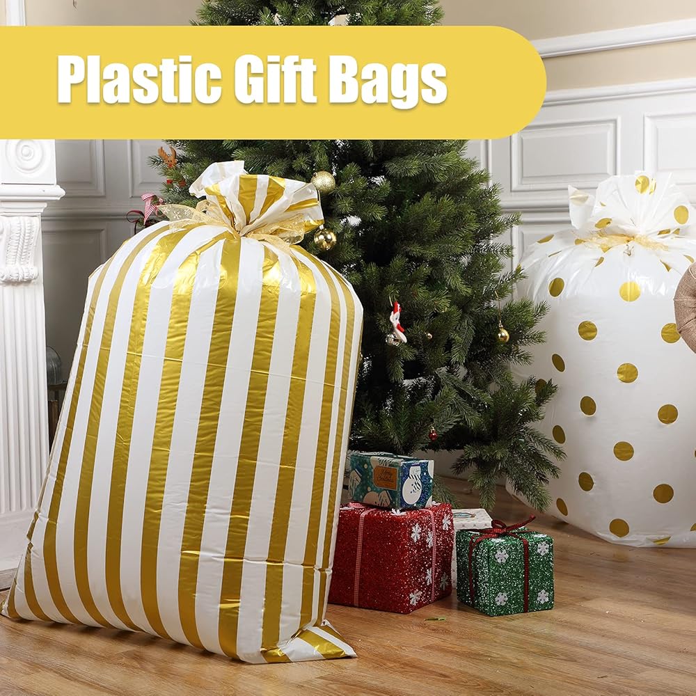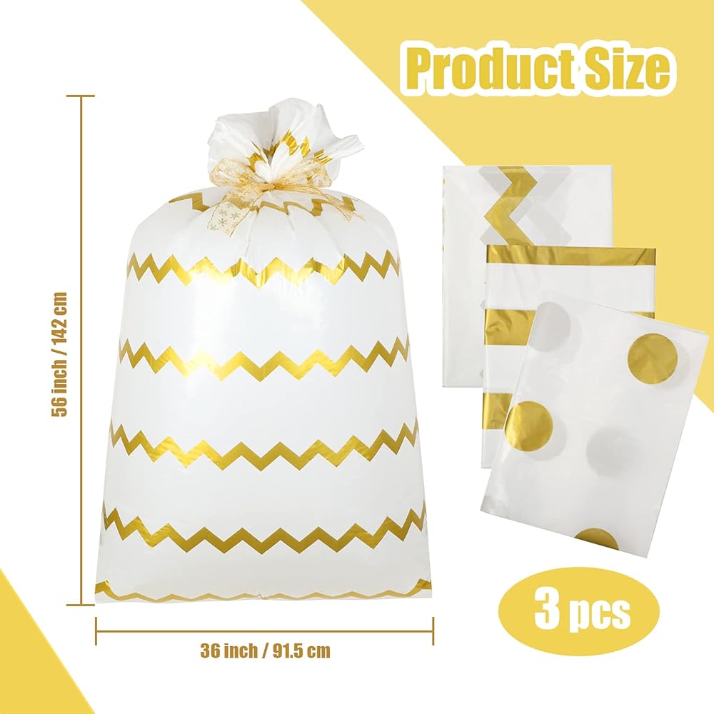 3 Pieces 56 x 36 Inches Christmas Large Jumbo Plastic Gift Present Bag with Ribbon Chevron Round Dot and Stripe Wrapping Bags for Christmas Parties Holiday Parties and Birthdays Weddings (Gold)