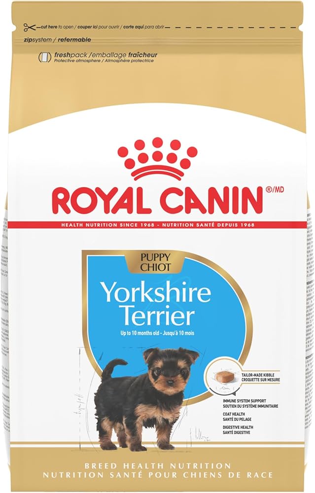 Unmatched companions, Yorkshire Terriers are friendly, intelligent, and full of life. That's why Royal Canin created breed-specific formulas, like this one especially for your purebred Yorkshire Terrier, to help meet their unique nutrition needs. Royal Canin Yorkshire Terrier Adult Dry Dog Food is tailor-made nutrition created just for your Yorkie pure breed. This exclusive breed-specific diet is uniquely formulated for your small breed Yorkshire Terrier with specific nutrients to help small dogs thrive. The specialized kibble shape and texture are designed for your toy breed's small jaw, making it easy for little dogs to pick up and chew. Biotin and omega-3 and -6 fatty acids help maintain healthy skin and coat. Targeted nutrients including vitamin C, EPA, and DHA help support your toy dog's vitality. And the combination of this Yorkie dog food's kibble shape and texture helps reduce tartar formation by encouraging your Yorkie to chew. With over 50 years of scientific research and observation, Royal Canin continues to deliver targeted nutrition to feed every dog's magnificence. Not satisfied? Then neither are we. Our breed health formulas are 100% satisfaction guaranteed. (Just contact us for more details.)