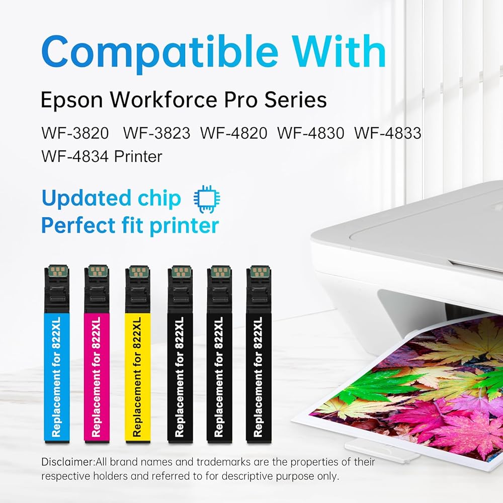 Remanufactured for epson 822xl ink cartridges combo pack compatible for printers: Epson Workforce Pro WF-3820, WF-3823, WF-4820, WF-4830, WF-4833, WF-4834 Printer