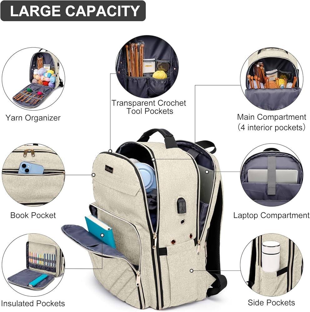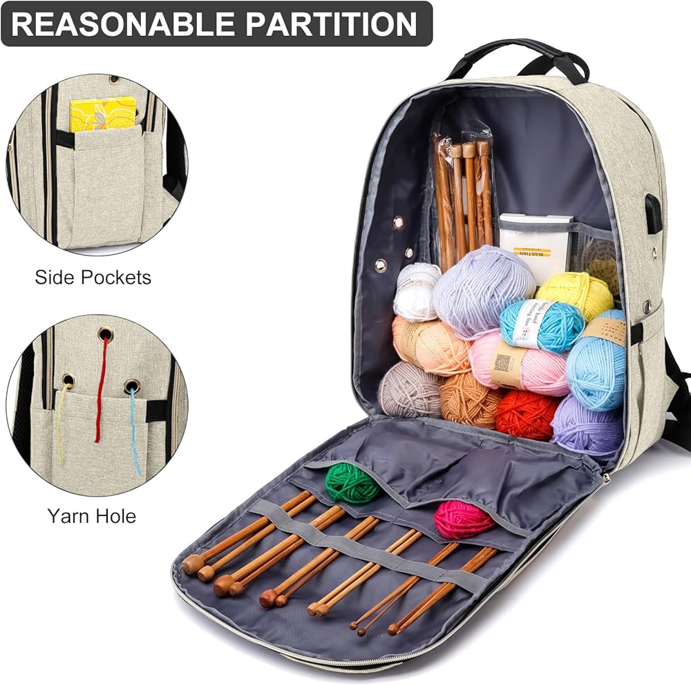 Suitable For Various Crochet Items: The crochet bag has 6 inner pockets with elastic straps, which can accommodate 14 inches of knitting needles. 3 transparent PVC inner bags can store many different types of knitted items. The spacious space can store up to 10 bundles of wool. The backpack has 3 matching holes on the side, allowing you to feed wool seamlessly with perfect tension without any pressure, obstacles, or entanglements (excluding accessories).