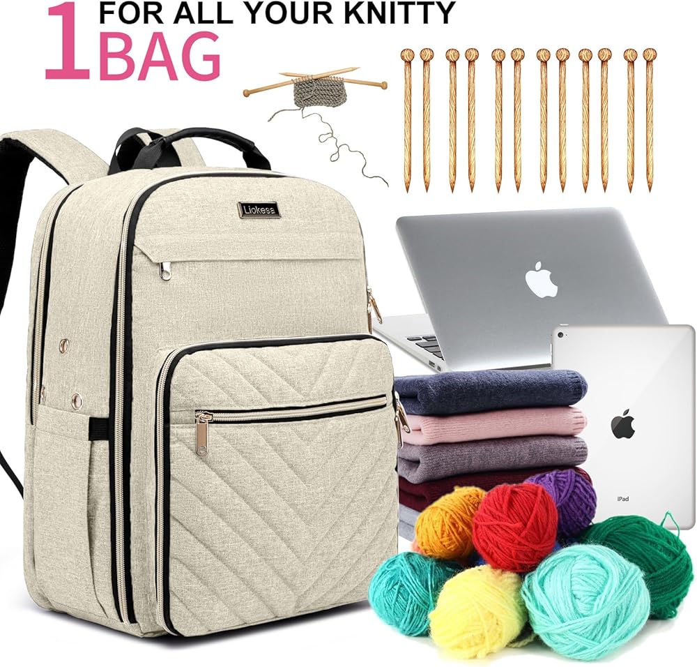 Large Capacity: 16.5 * 12 * 8.5 Inch, 30L. Yarn storage tote bag can store 30 pieces of 50g yarn. Knitting/crochet backpacks are perfect for large projects that require a large number of wool balls. Backpack have a spacious main compartment for storing unfinished carrying projects. There is a laptop compartment inside the backpack that can accommodate 15.6 inch laptops.