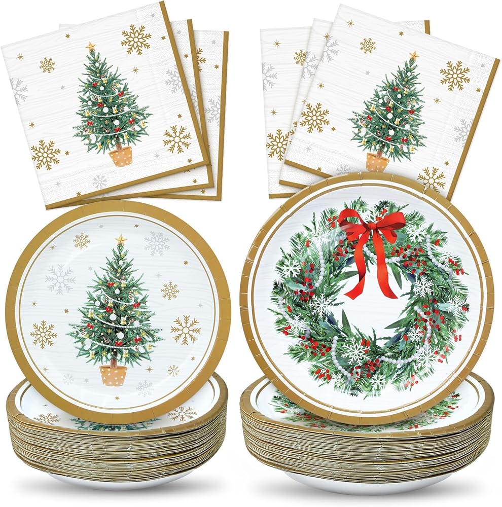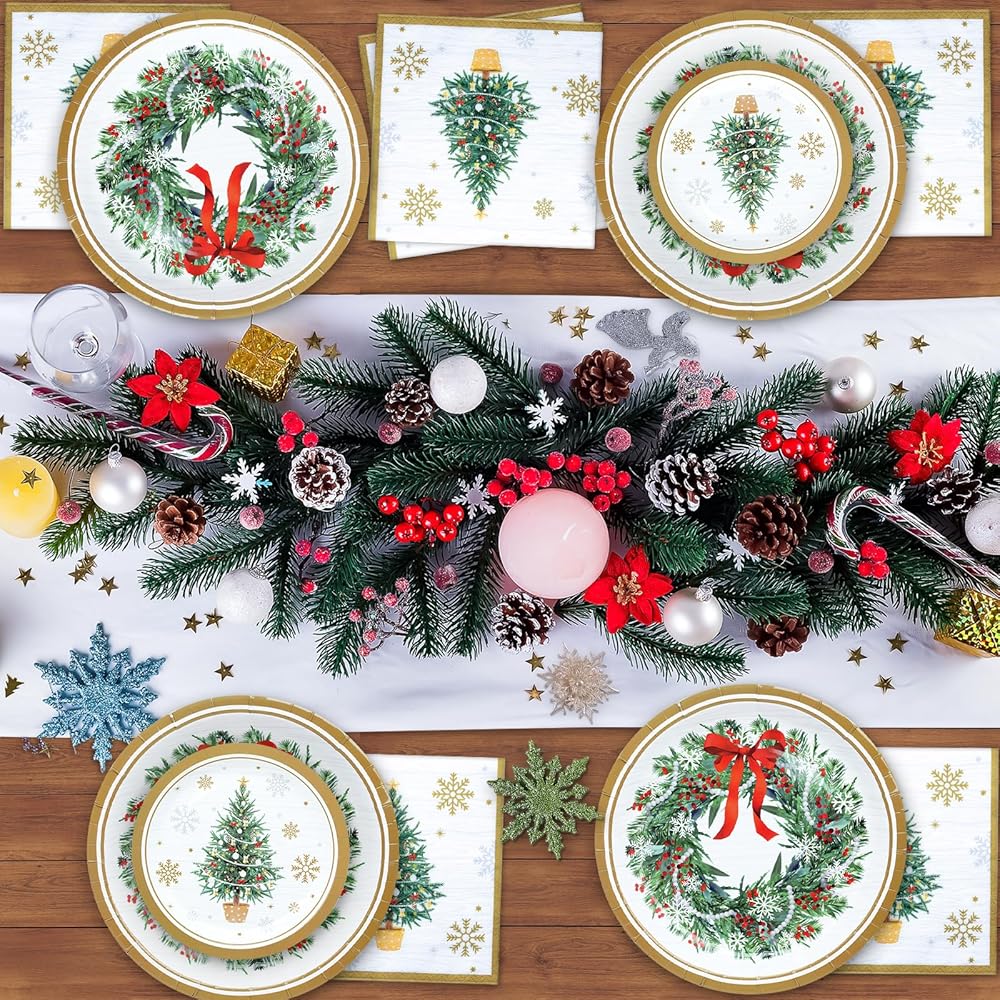 - 150 Count Disposable Christmas Party Dinnerware Set Includes 50 x 7in Dessert Plates, 50 x 9in Dinner Plates, 50 x Lunch Napkins 13in.