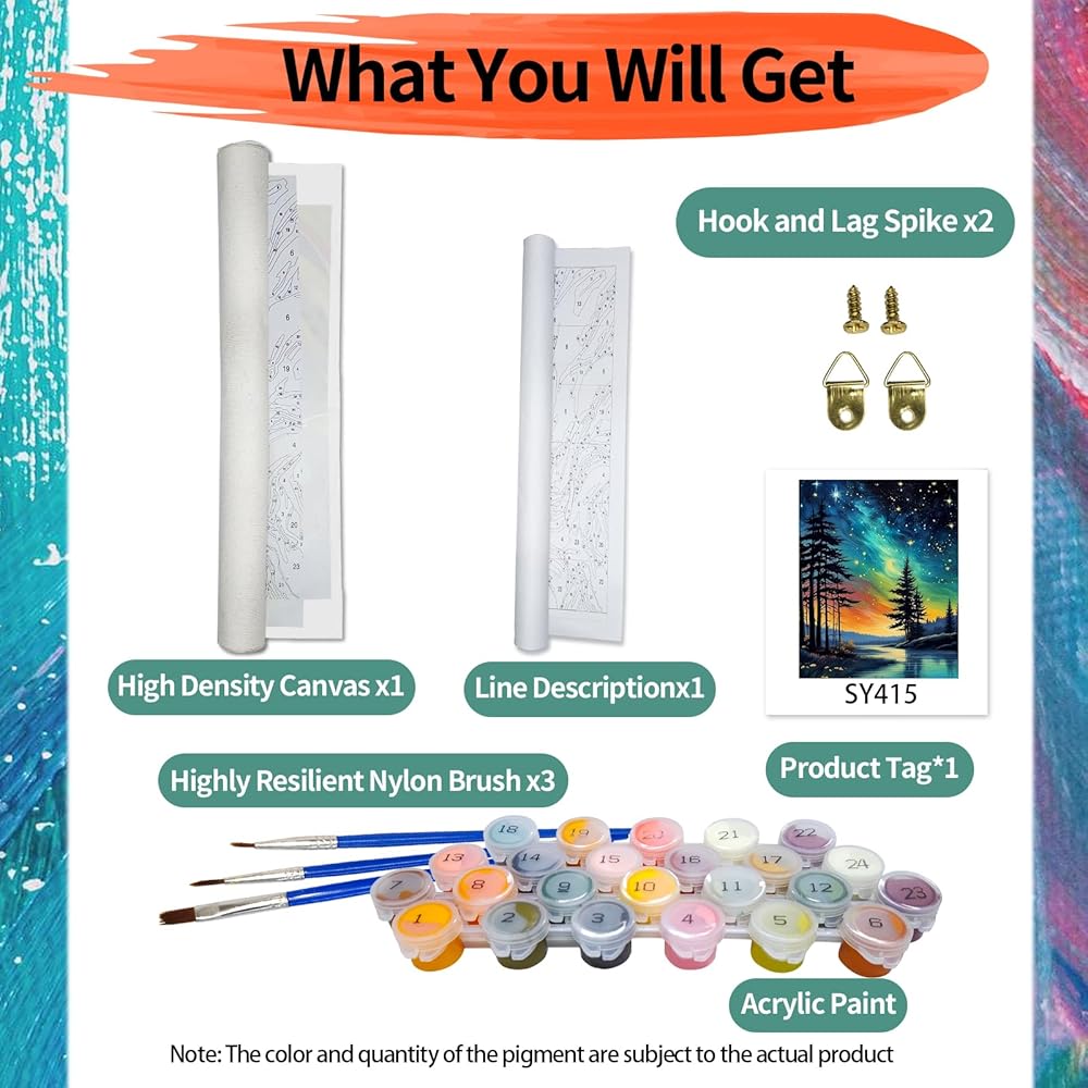 WHAT WILL YOU GET: You will receive a paint by number kit including HD Pre-printed canvas x 1, different sies brushes x 3, acrylic paint set x 1, hook x 2, providing you with everything you need to paint.