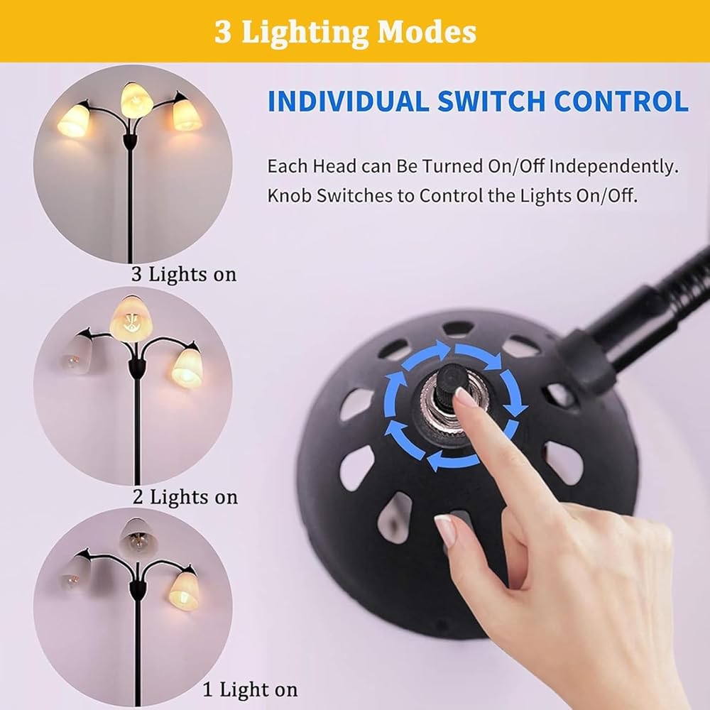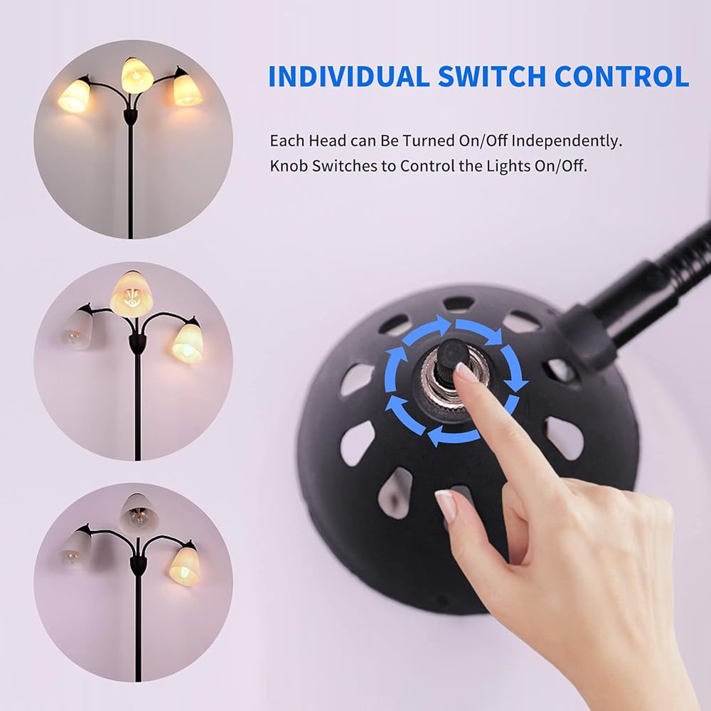 【Work Independently】: Each light of this 3-Light Multi Head Reading Floor Lamp can work independently without being affected by each other. You can turn on only one or two or all of them. The black knob switch behind the lampshade of each light can help you easily control the lights to turn on & off.
