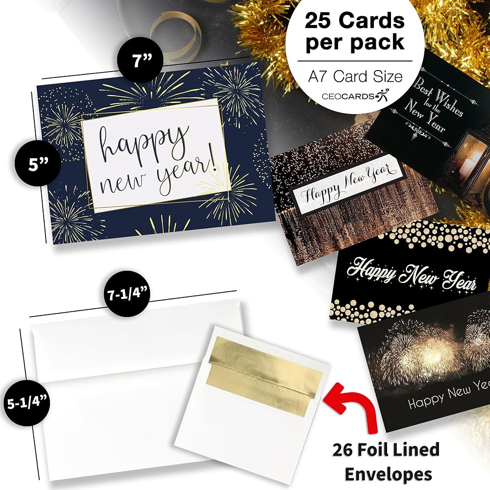 Happy New Years Cards with Gold Foil Envelopes for Business & Family (25 Pack - Variety) Bulk Greeting Card 2026 New Year Set (5x7 inch) Office, Work Employees & Clients (VP1505) Made in USA