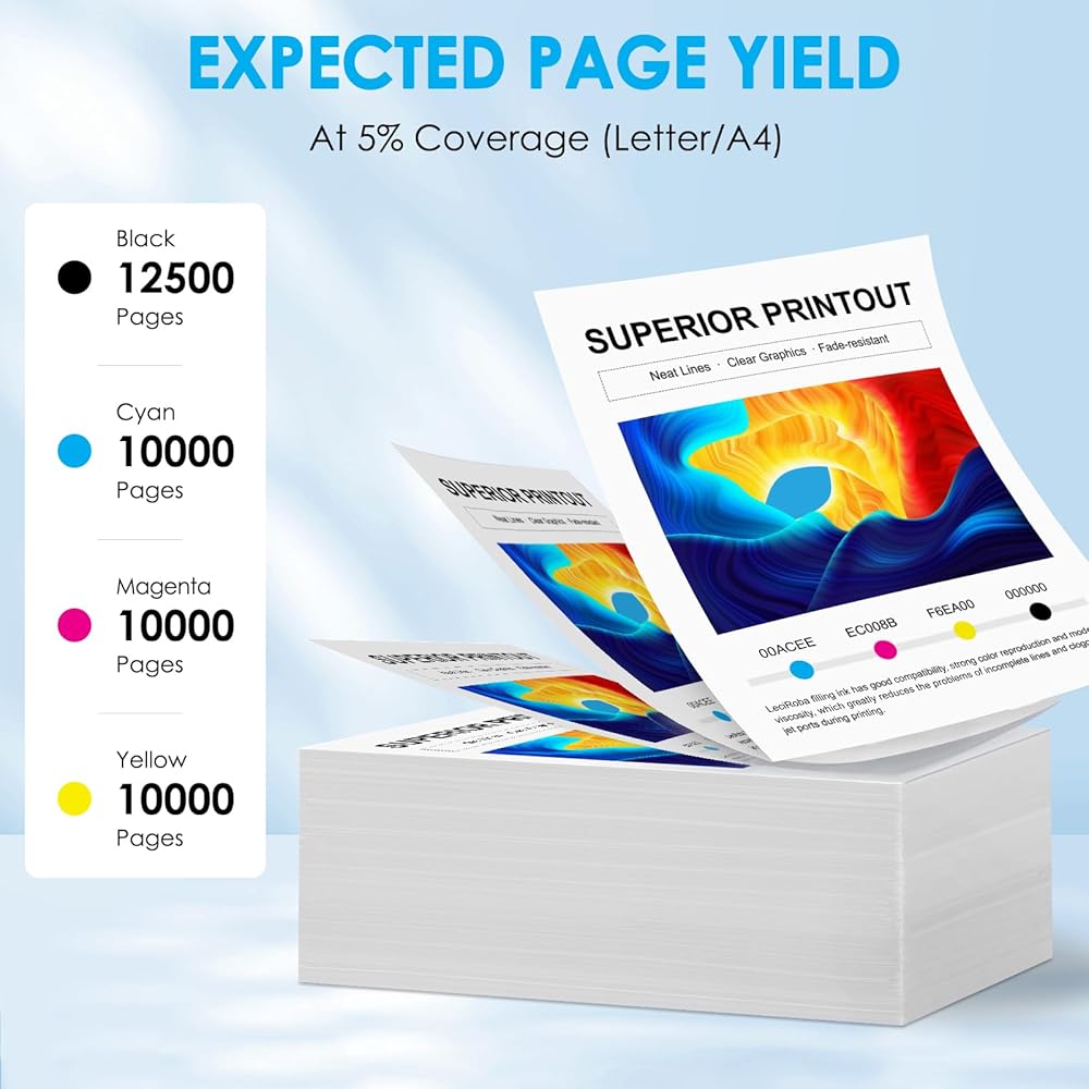 High Page Yield: 12,500 pages per Black, 10,000 pages per Cyan Magenta Yellow at 5 percent coverage of letter/A4.