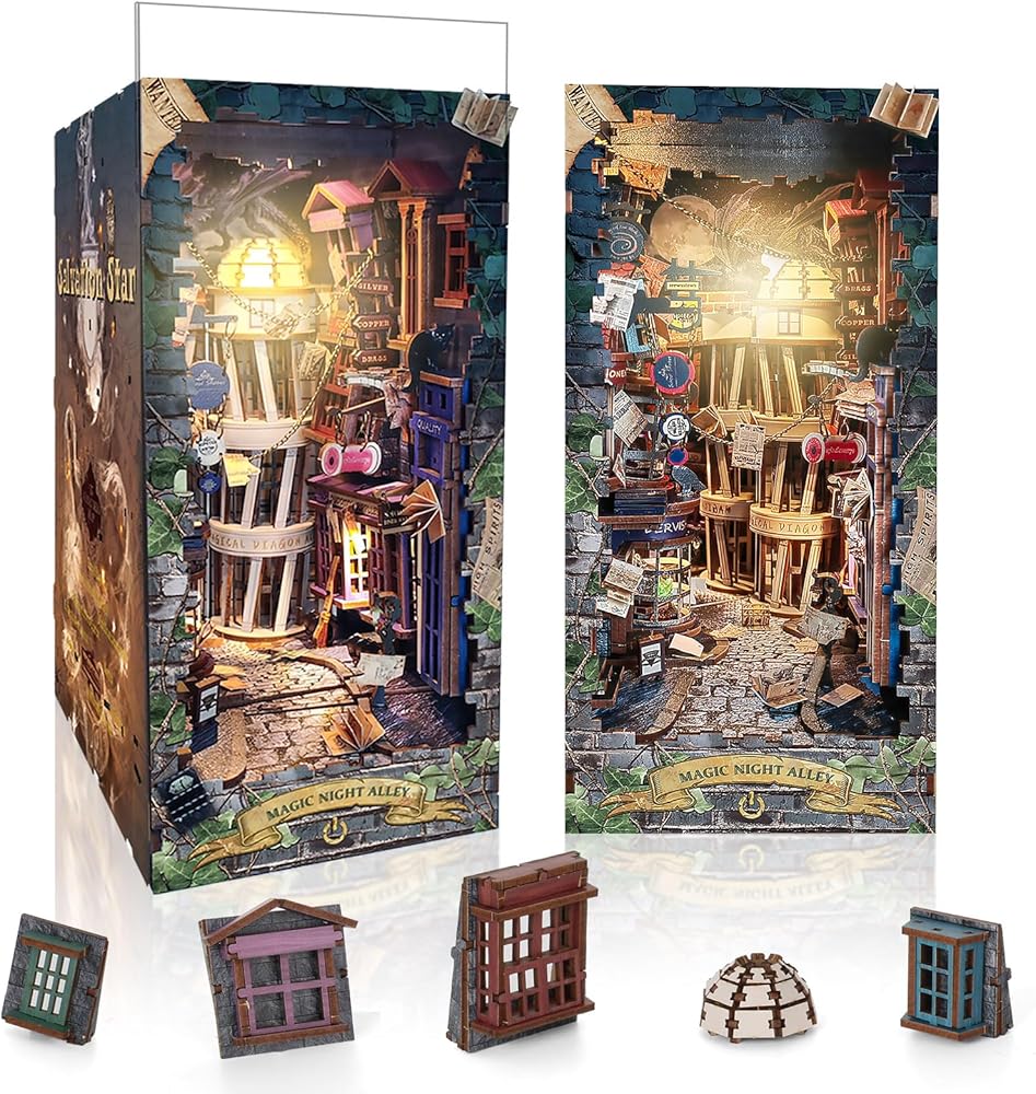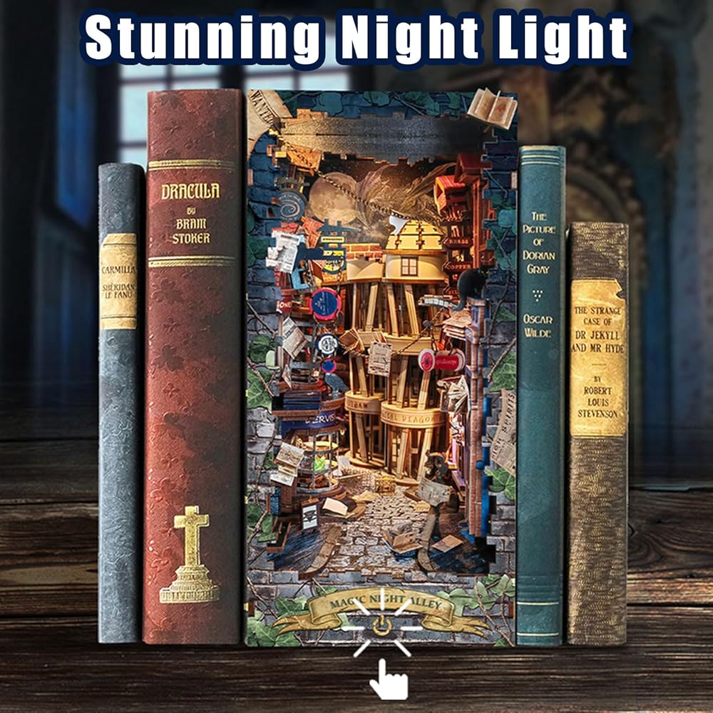 DIY Book Nook Kit,Miniature Dollhouse for Adults Teens,Booknook Bookshelf Insert Decor,Dust Proof 3D Wooden Puzzles,Tiny House Easter Halloween Home Decor,Birthday Gifts(Magic Night Alley)