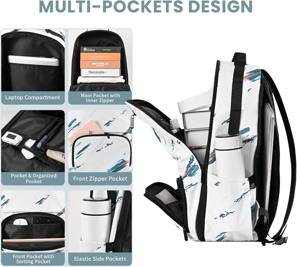مساحة تخزين كبيرة وجيوب متعددة: حقيبة ظهر للمدرسة بحجم: 17.7 × 11.4 × 6.3 بوصة (ارتفاع × عرض × عمق)، السعة: 21 لتر. تحتوي الحجرة الرئيسية على جهاز iPad مقاس 12.9 بوصة أو كمبيوتر محمول مقاس 16 بوصة والضروريات اليومية، حجرة كمبيوتر محمول منفصلة ومزودة بسحاب في الخلف تحتوي على كمبيوتر محمول مقاس 15.6 بوصة وتحميه من التلف. جيبان أماميان بسحّاب، و4 جيوب داخلية للفرز، وفتحتان للأقلام، 1 جيب داخلي بسحاب، 2 جيب جانبي مرن، 1 جيب خلفي لجواز السفر أو الهواتف الذكية