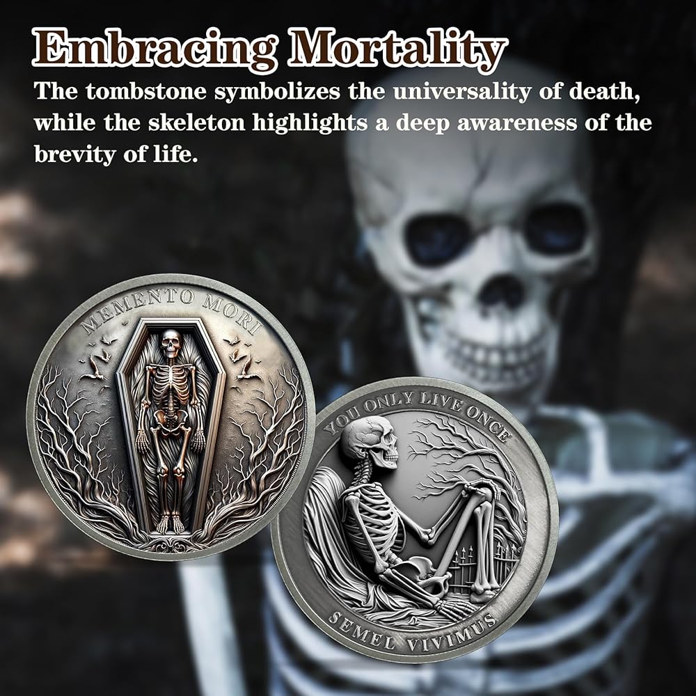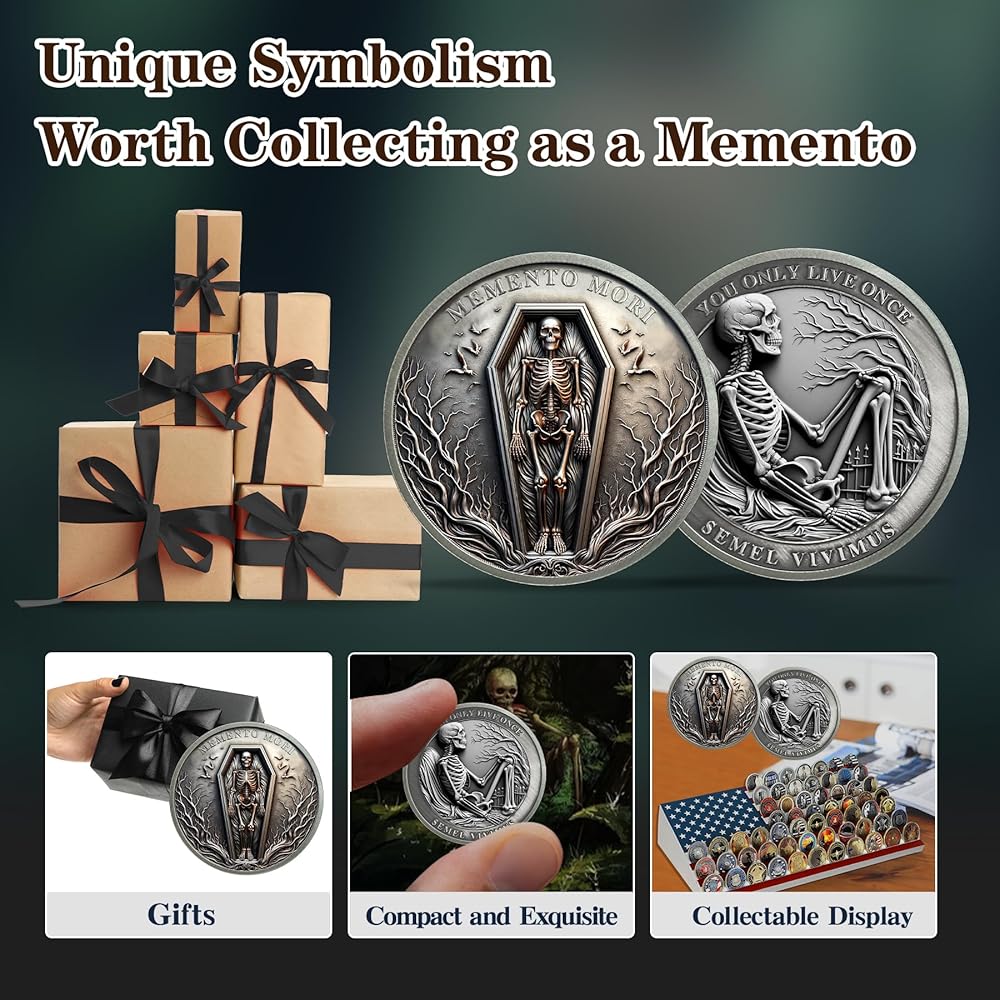 Memento Mori Memento Vivere Coin: 1.57inch/4cm in diameters, made of zinc alloy plated materials, packaged by a transparent display case.
