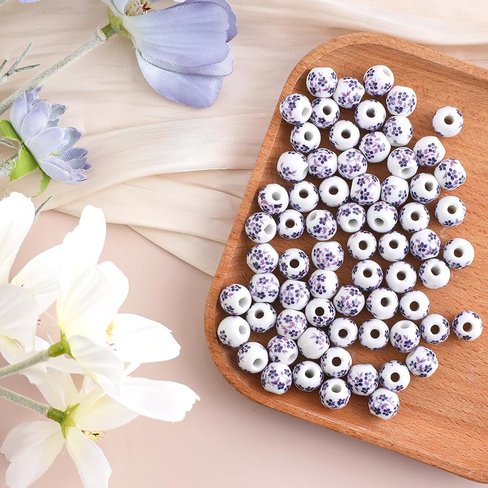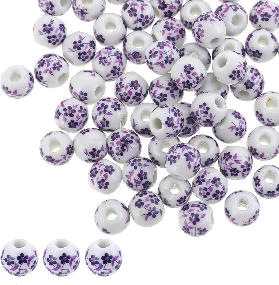 100Pcs Ceramic Beads, 10mm Ceramic Beads Handmade Porcelain Flower Round Beads Spacer Beads Craft Beading Kit for Jewelry Making and DIY Crafts(Purple)