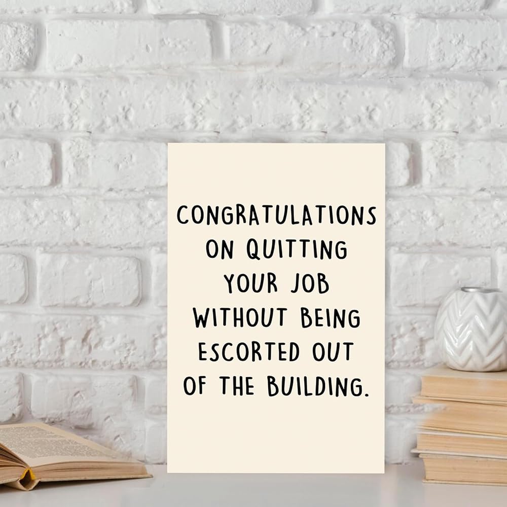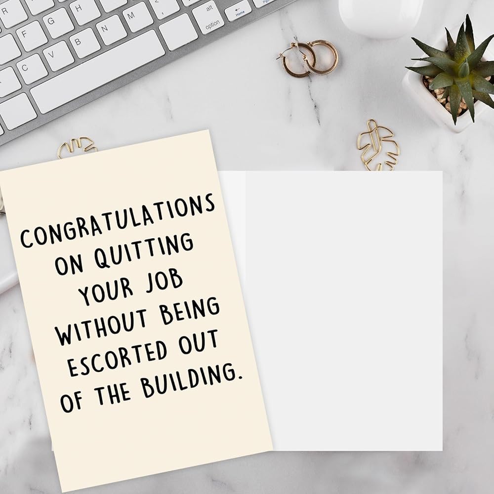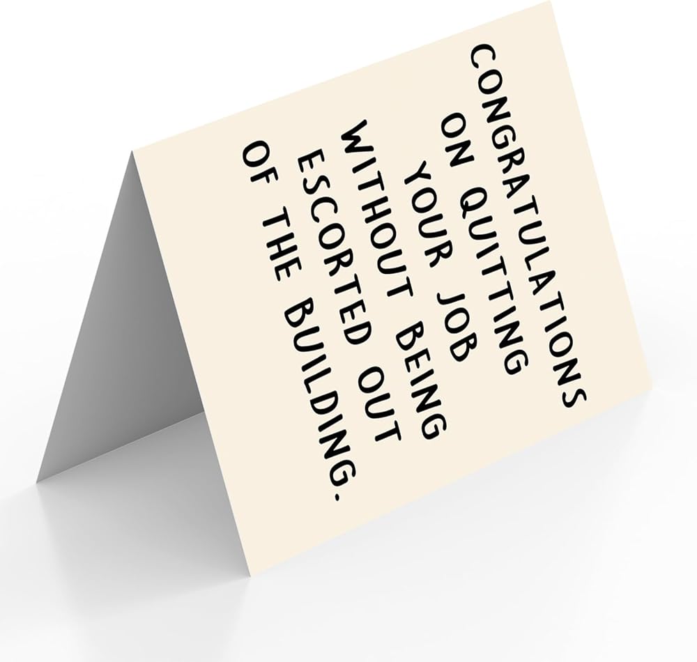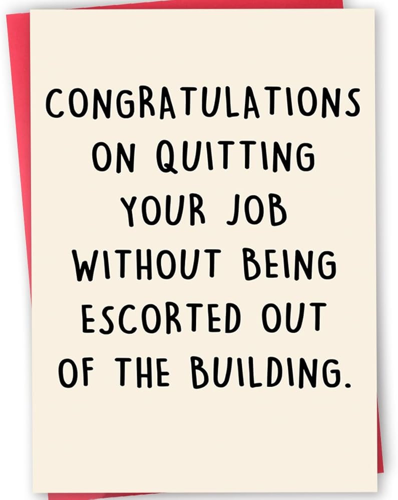 Unique Farewell Card--This funny card features hilarious words on the front and comes with this text “ congratulations on quitting your job without being escorted out of the building ”.