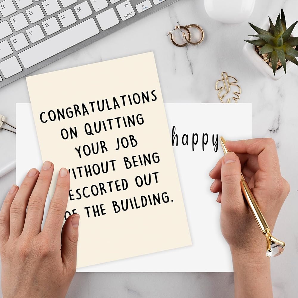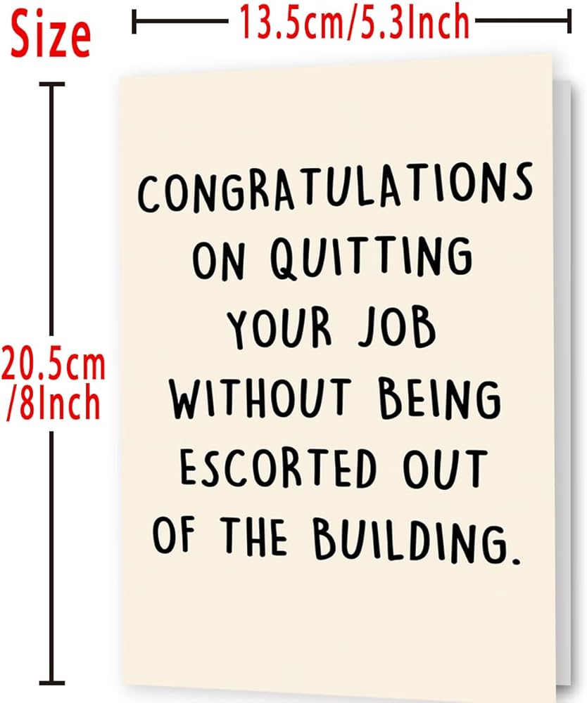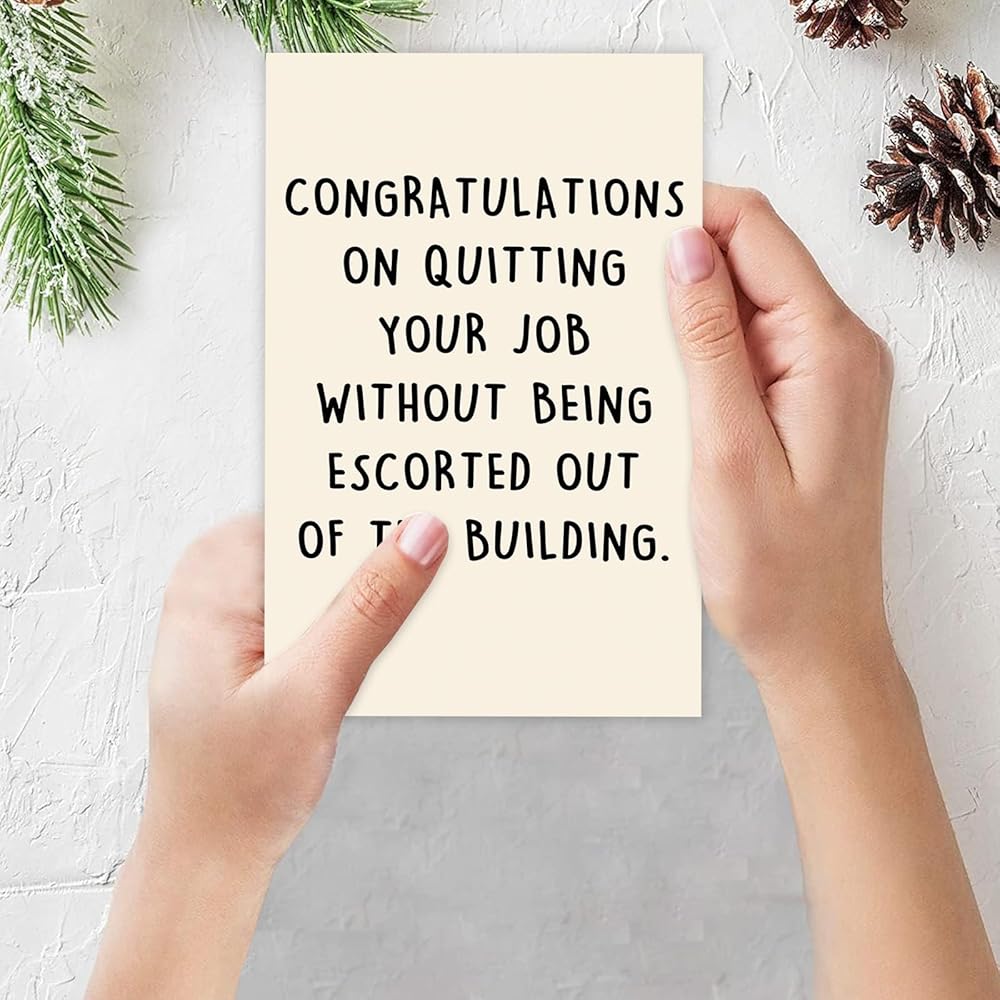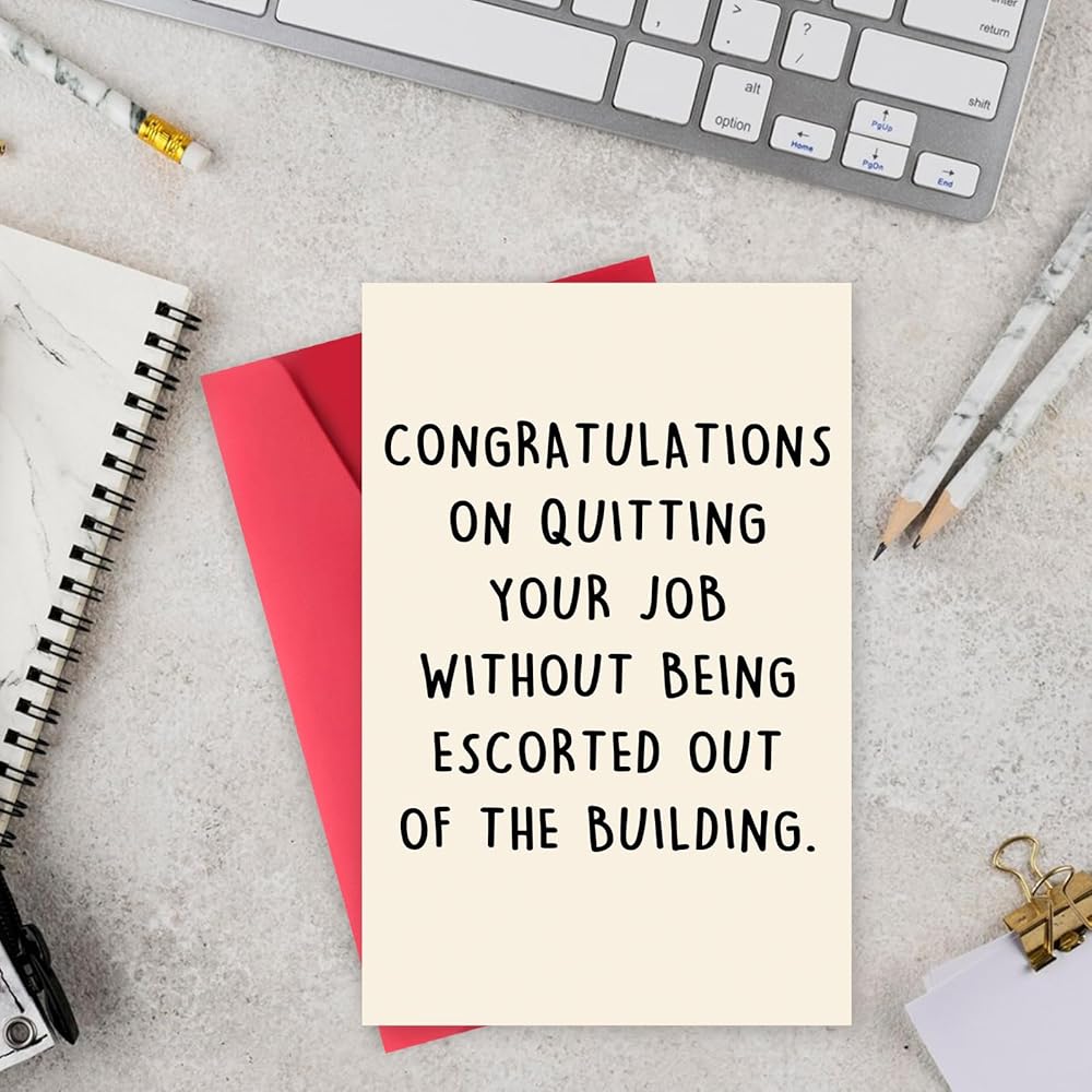 Unique Farewell Card--This funny card features hilarious words on the front and comes with this text “ congratulations on quitting your job without being escorted out of the building ”.