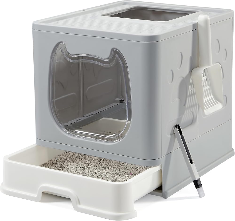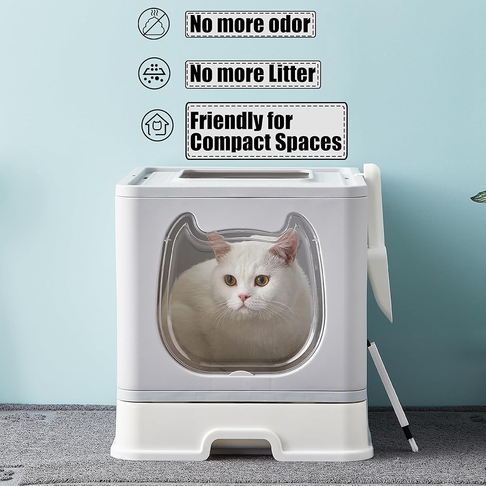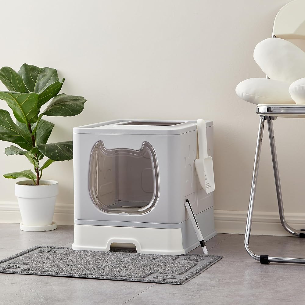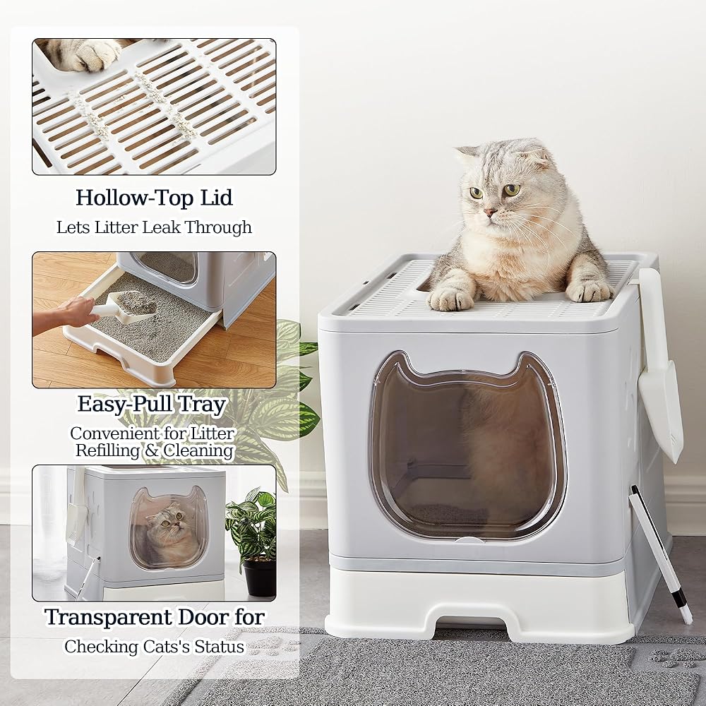 Cat Litter Box with Lid: The top of the box is grid-shaped, as the kitties climb out of the top they leave litter behind on the top of the litter box, providing some reduction in the amount of litter outside the box as well as it trains the cat's jumping and increases the fun.