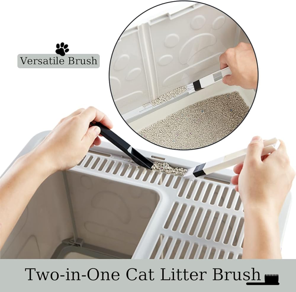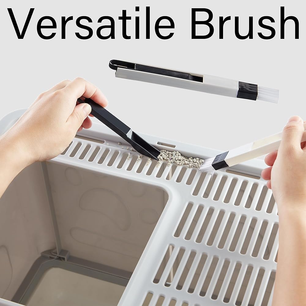 Easy to Clean: The bottom slides out to clean the litter pan, it makes it easy to scoop litter, without having to take a lid off. Brushes can better help you clean up the rubbish on the sidewall.