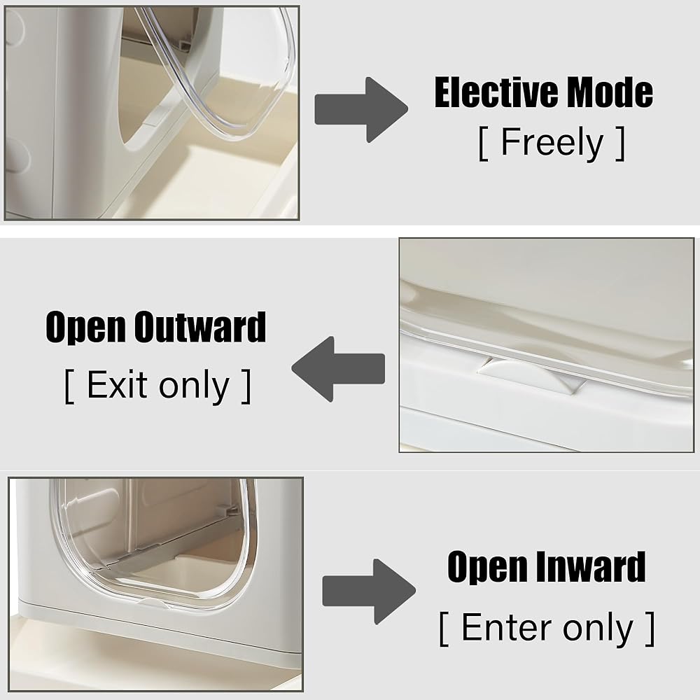 The clear swinging door is controllable with a removable buckle. Your kitten can choose the way enter and exit as he or she chooses according to his or her life habits. The transparent door allowing you to monitor waste buildup and allowing your cat to observe the outside world.