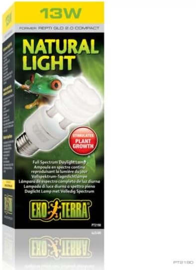 The Exo Terra Natural Light is a full spectrum daylight bulb with a very high visual light output and high color rendering index (98 CRI). With its high visual light output and 6700 K Color temperature, the Natural Light Terrarium Bulb is recommended as general light source for all terrarium types. The high light output makes this bulb suitable for planted terrariums and it is ideal for animals with lower UV requirements, such as snakes, amphibians (frogs, toads and salamanders) and nocturnal animals. Combine this full spectrum daylight bulb with Exo Terra's Reptile UVB100, Reptile UVB150 or Reptile UVB200, depending on the reptile's UV requirements, to intensify natural sunlight conditions.