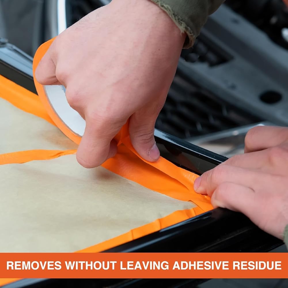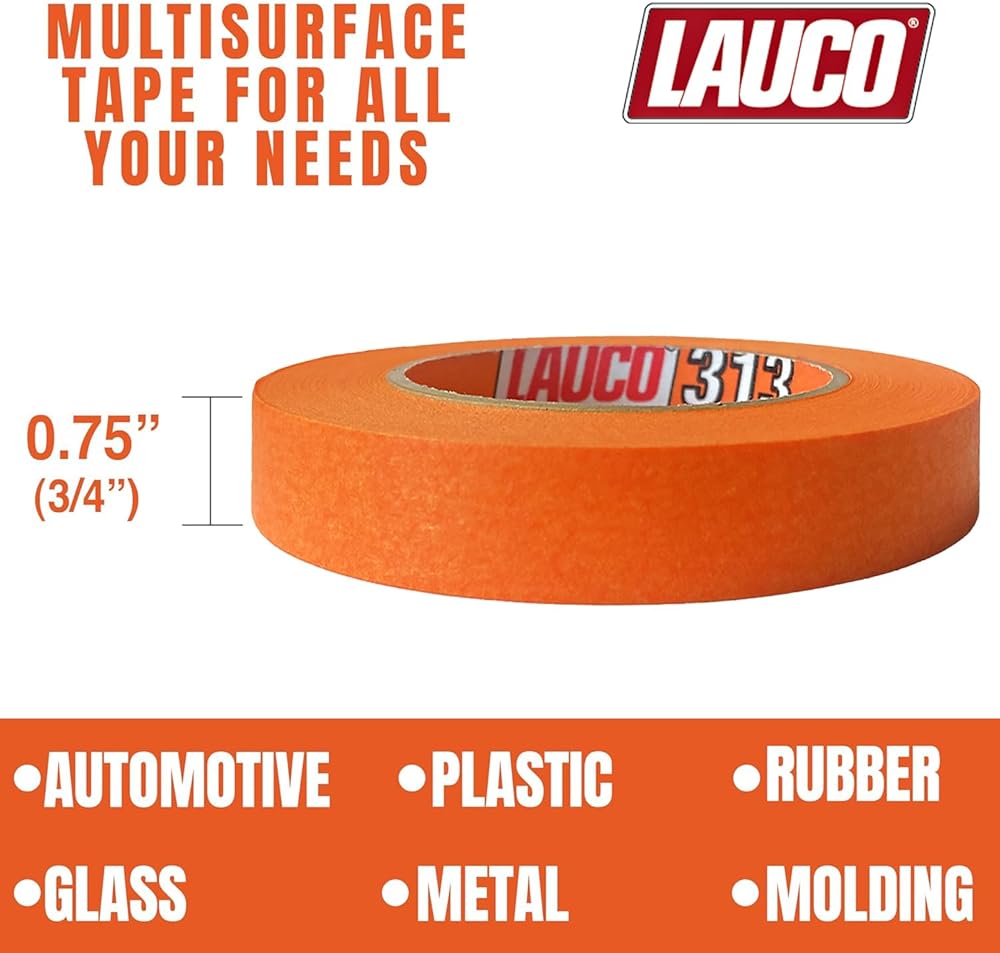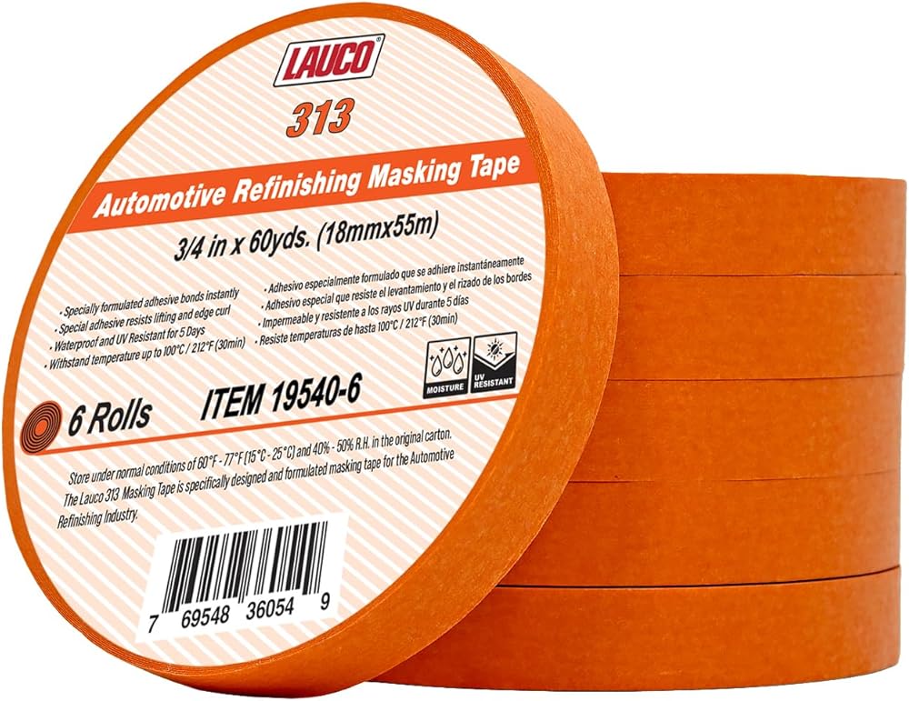 LAUCO Orange Automotive Refinishing Masking Tape – Autobody Painter’s Tape, Moisture, UV & Heat Resistant, No Residue – Multi-Purpose Masking Tape for Auto Repair (0.75 in, Pack of 6 Rolls)