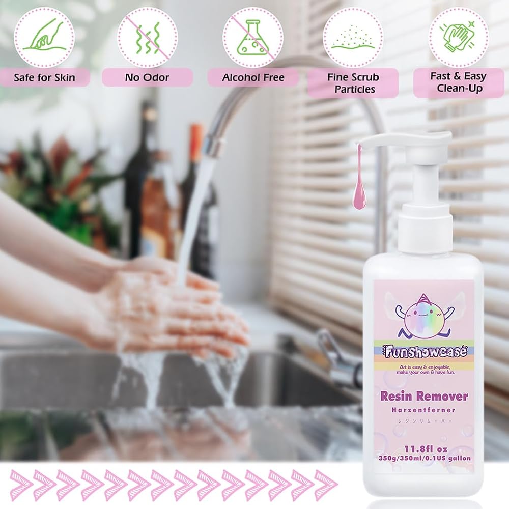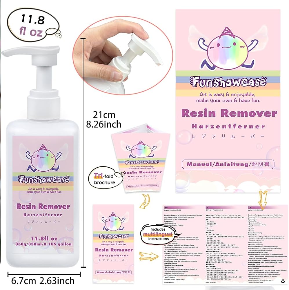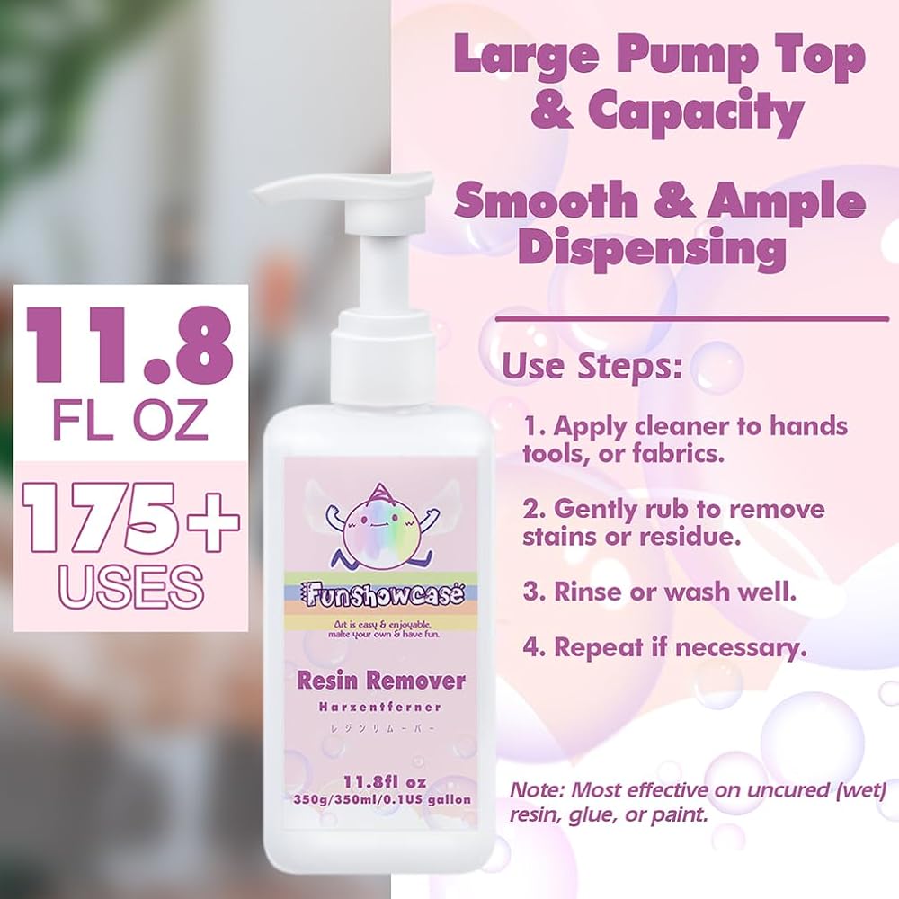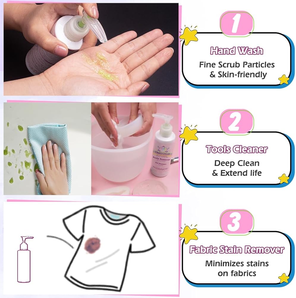 Cleaning solution kit to remove uncured epoxy or UV resin, clean up work surfaces, tools, bottles, resin molds, silicone mats, brushes, palettes, mica, pigment, dye, acrylic paint, glue, resin measuring cups, mixing cups, resin mixing kits, liquid silicone, spilled gel nail polish, contaminated clothes, and more