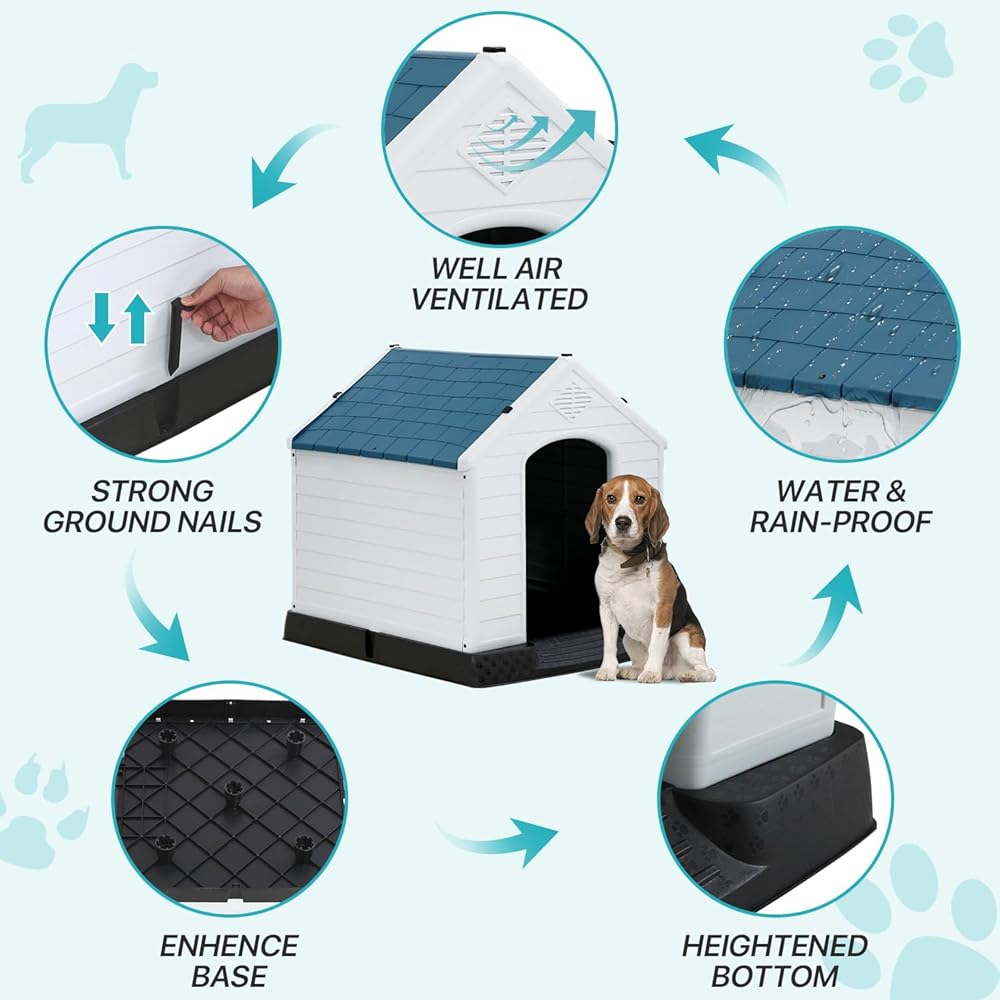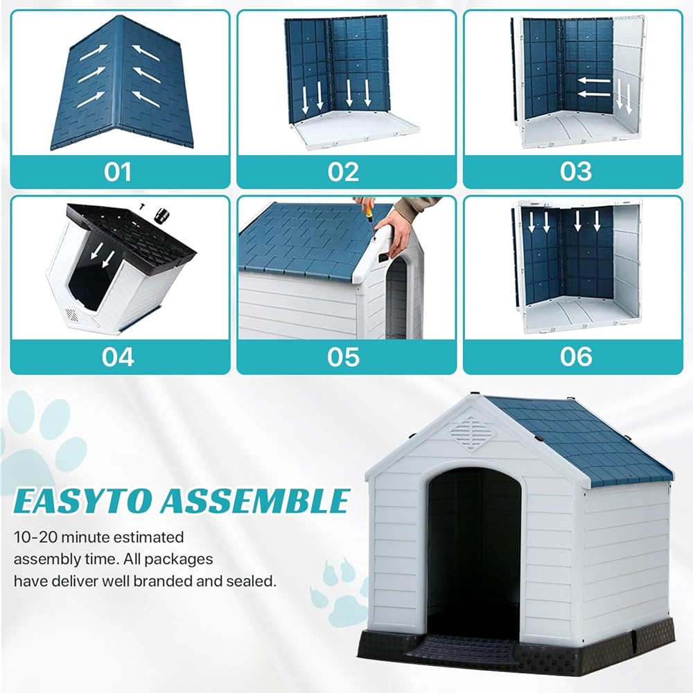 Outdoor Dog Kennel,Plastic Dog House Dog Kennel, Insulated Doghouse Puppy Shelter Water Resistant Easy Assembly Sturdy Dog Kennel with Air Vents and Elevated Floor (Blue,27''L*25''W*28''H)