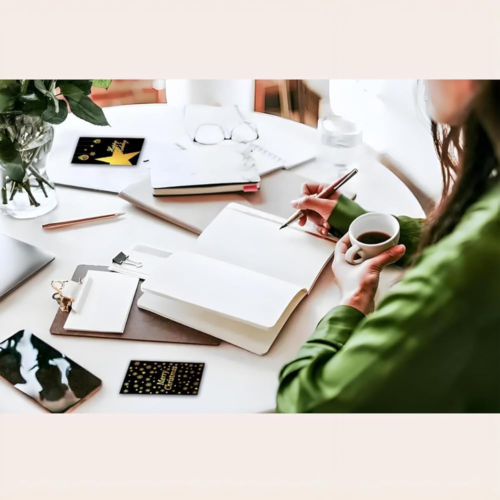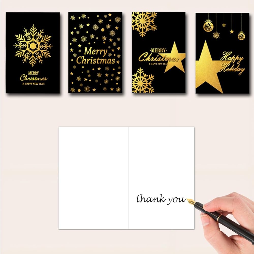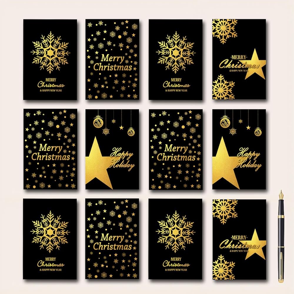 1.Elevate your holiday greetings with this stunning black and gold Christmas card set. Featuring a classic black backdrop accented with radiant gold details, each card exudes elegance of the season. Perfect for any celebration.