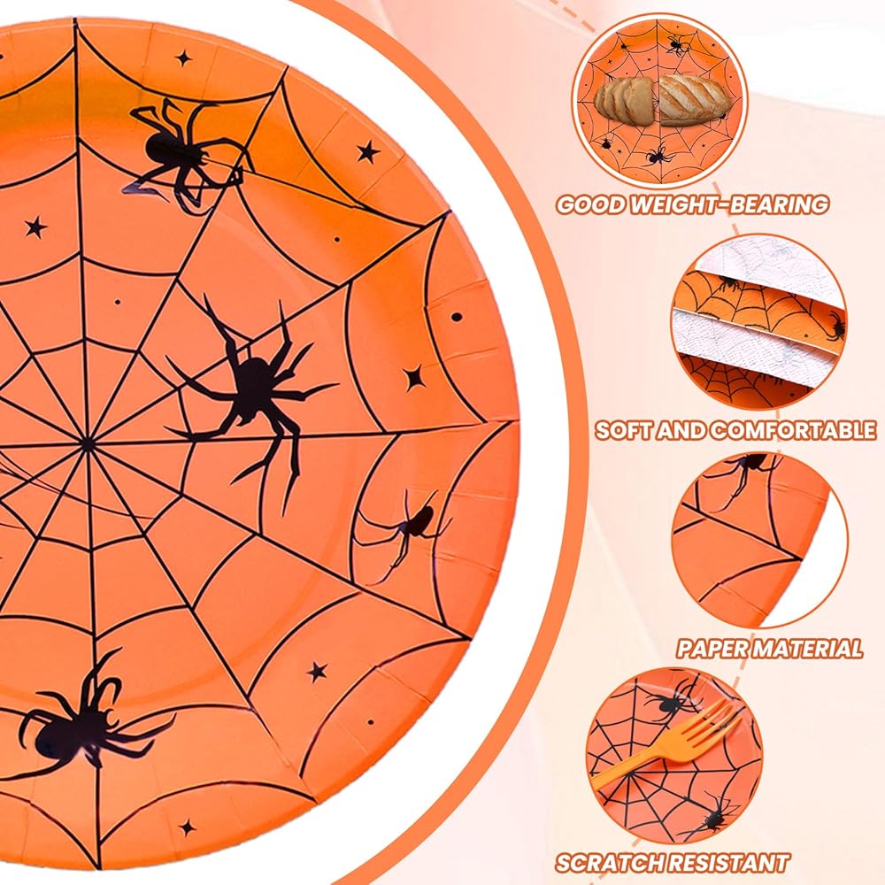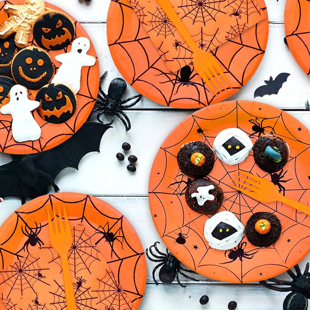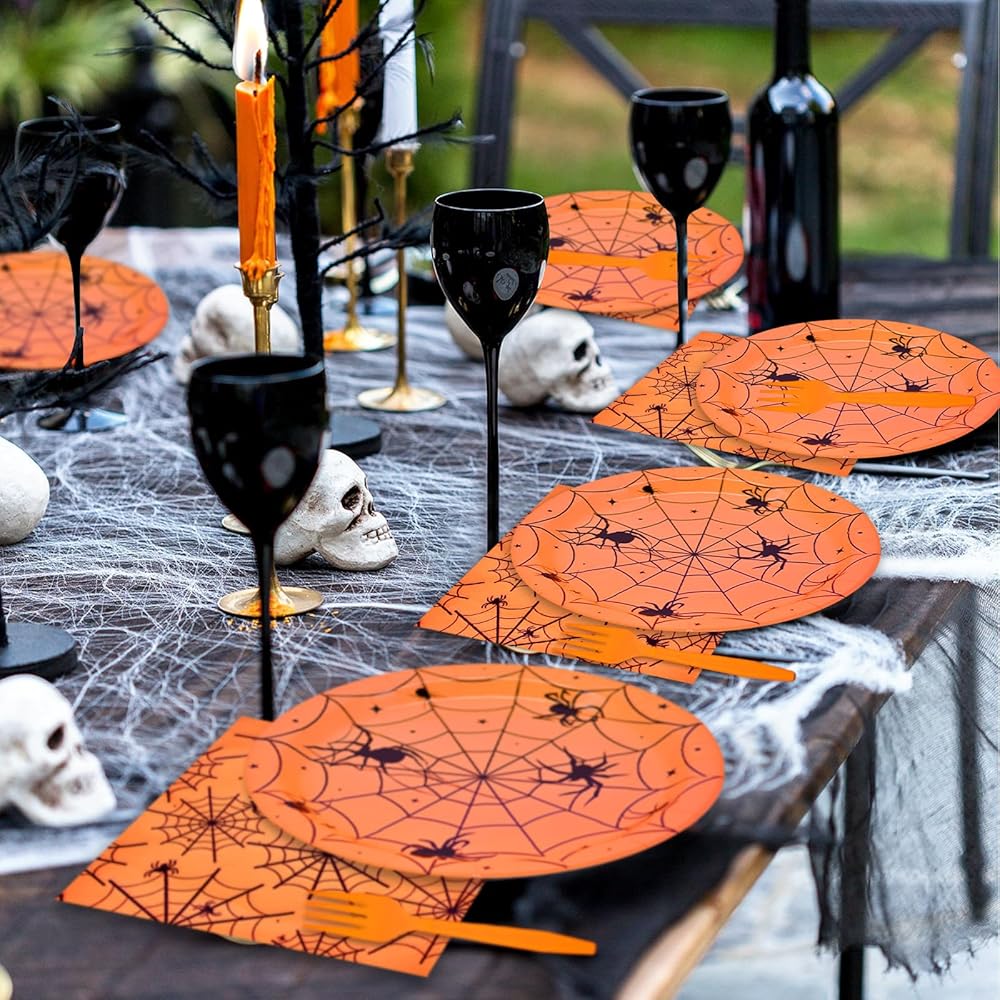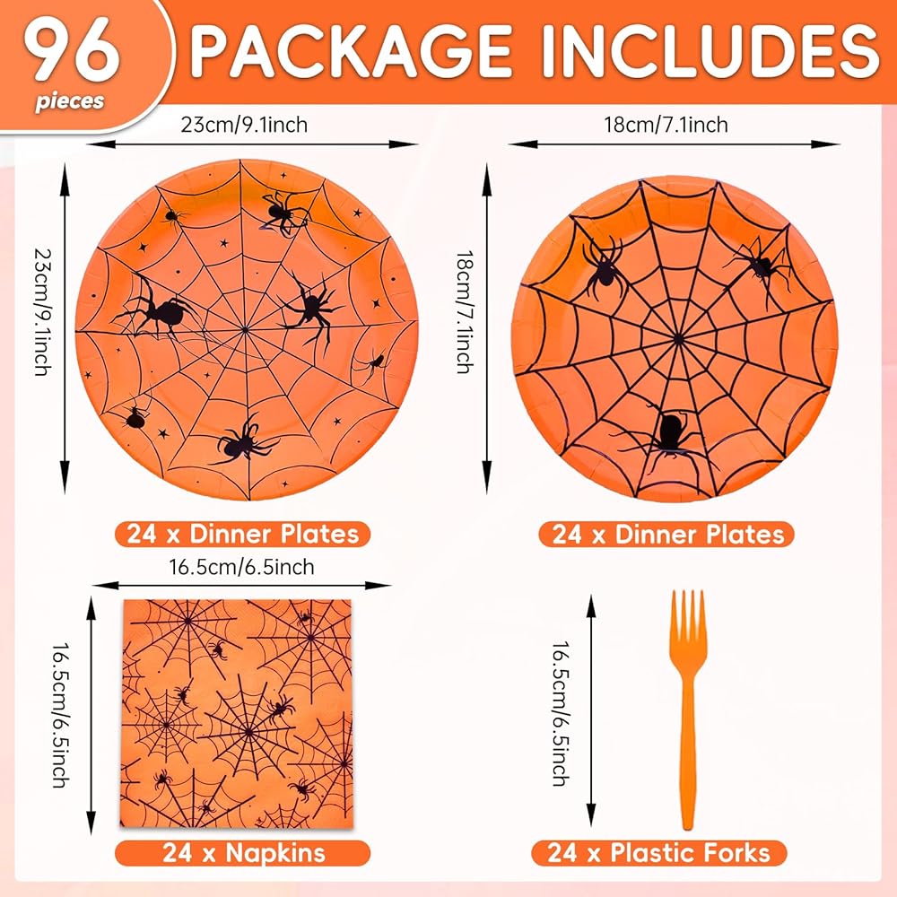 96 Pieces Halloween Spider Web Tableware Party Supplies - Disposable Dinnerware Set with Paper Plates, Napkins, and Forks for Spooky Halloween Party Supplies, Birthday Decorations - Serves 24 (Orange)
