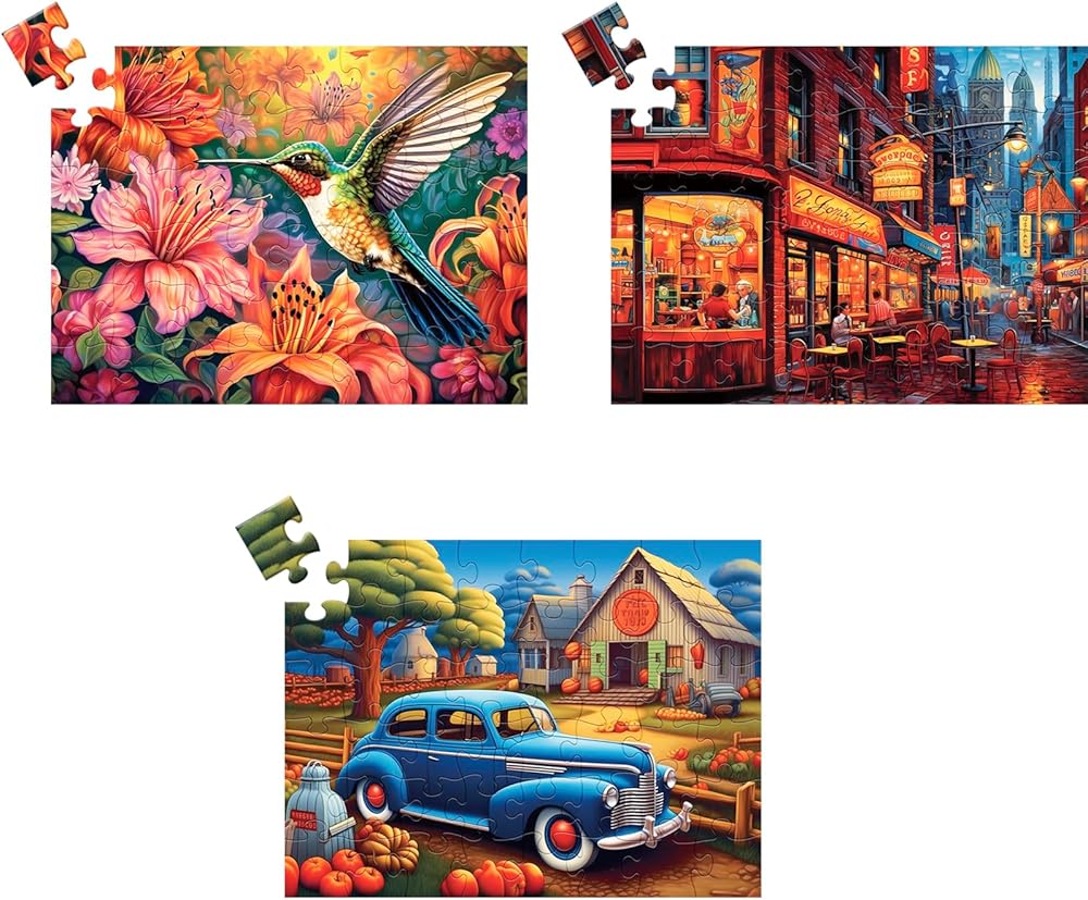 [6 Pack 36 Pieces Puzzles ]This set of puzzles for seniors provides six cute images of hummingbirds, puppies, mushrooms, turtles, cities, lakes. The bright colors and recognizable life images of the jigsaw puzzles can provide sensory experiences of attraction and focus for dementia or alzheimers elderly!