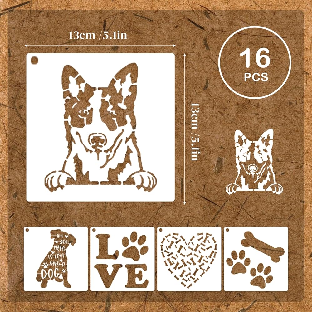 • 🐕︎Varied Designs & Perfect Size: The pack includes 16 distinctly designed stencils, featuring heart paw, leopard dog paw, love, dog mom, sunflower paw, etc., each measuring approximately 6 x 6 inches/ 15 x 15 cm.