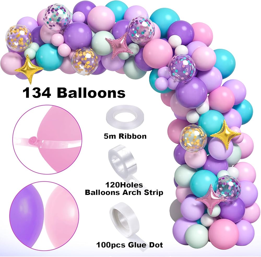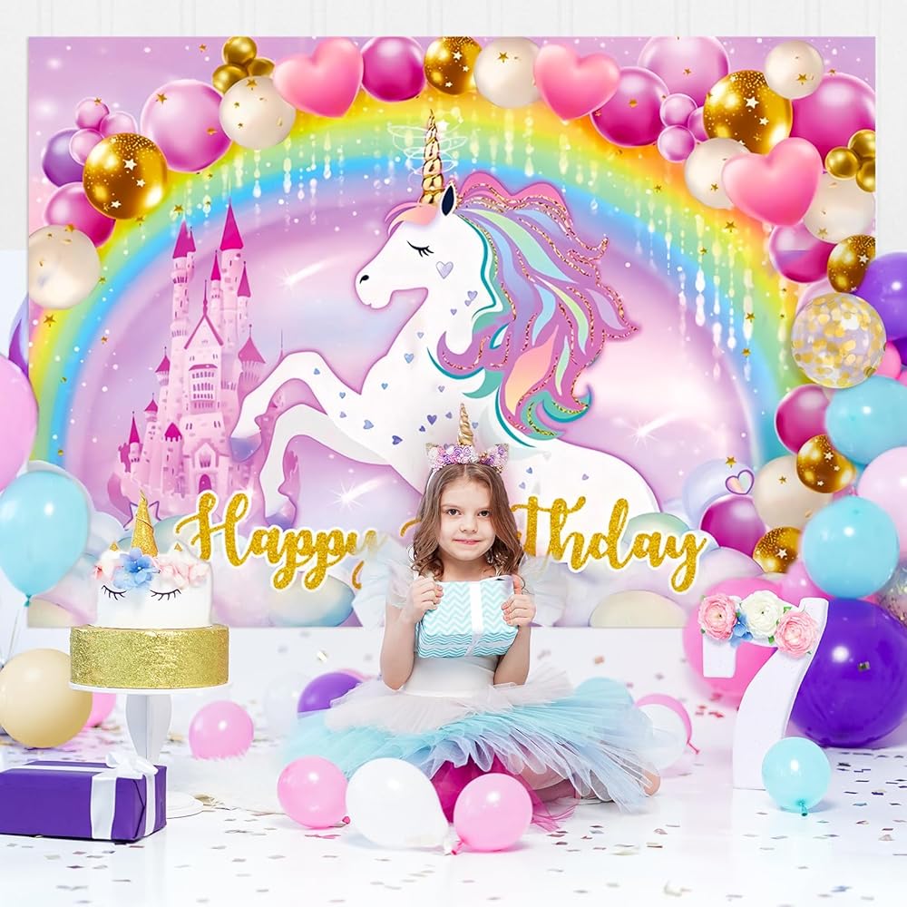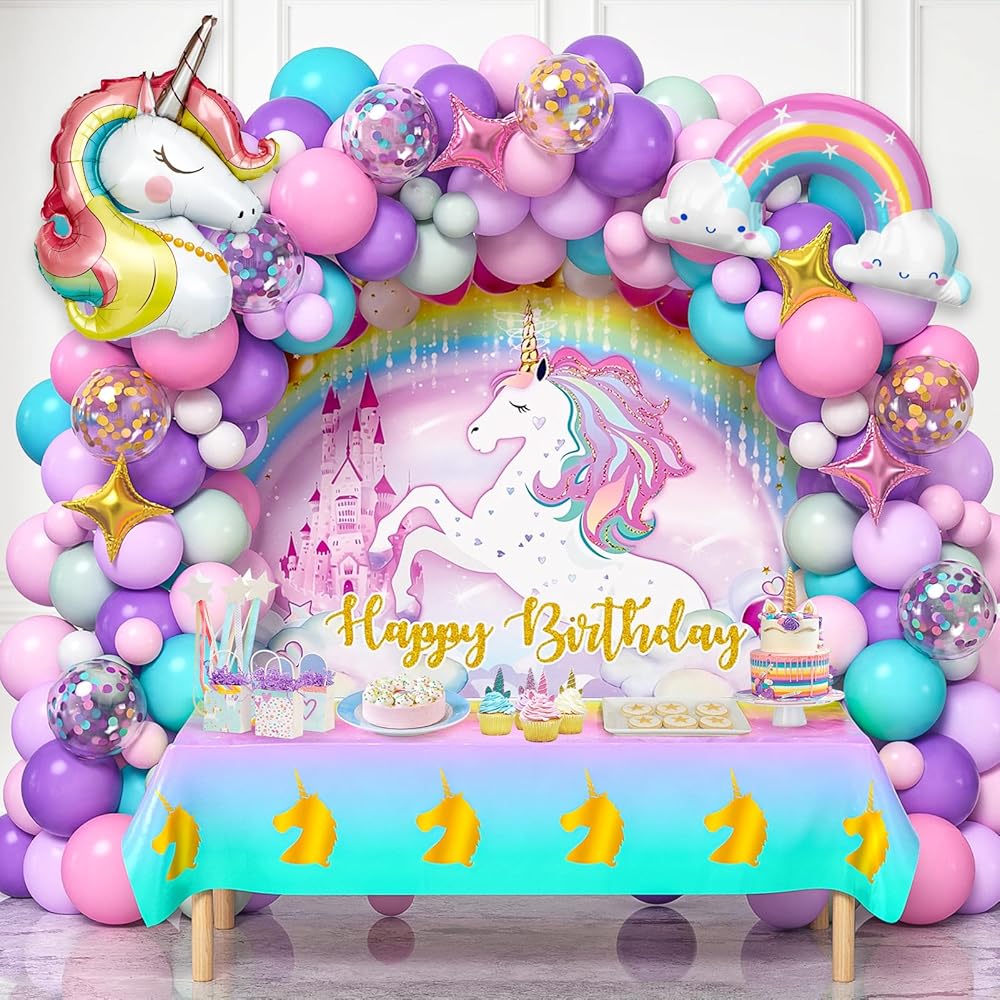 Unicorn Birthday Decorations for Girls: We have carefully prepared a set of unicorn themed birthday decorations. It comes with 133 latex balloons (5"+10"+12", 5 colors, with sequin balloon), 1 birthday backdrop (with hole and string), 1 tablecloth (gradient color), 2 large foil balloons (unicorn & rainbow), 4 stars; balloon accessories (glue points, ribbon, balloon chain). This is a rich set of party decor that can fully meet your needs and host a grand birthday party for your little princess