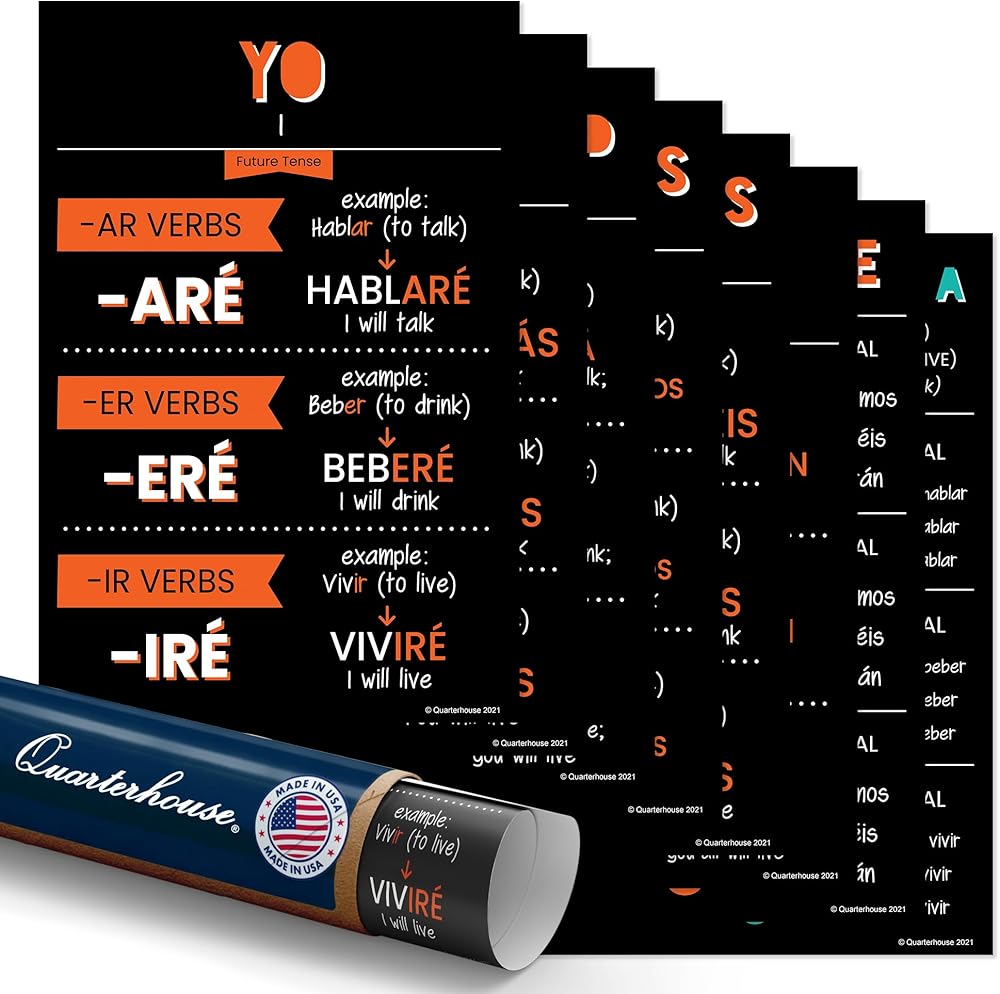 Quarterhouse 8 Poster Spanish Future-Tense Verb Conjugations Set, Spanish Classroom Learning Materials for Pre-K and K-12 Students and Teachers, 12 x 18 Inches, Made in USA
