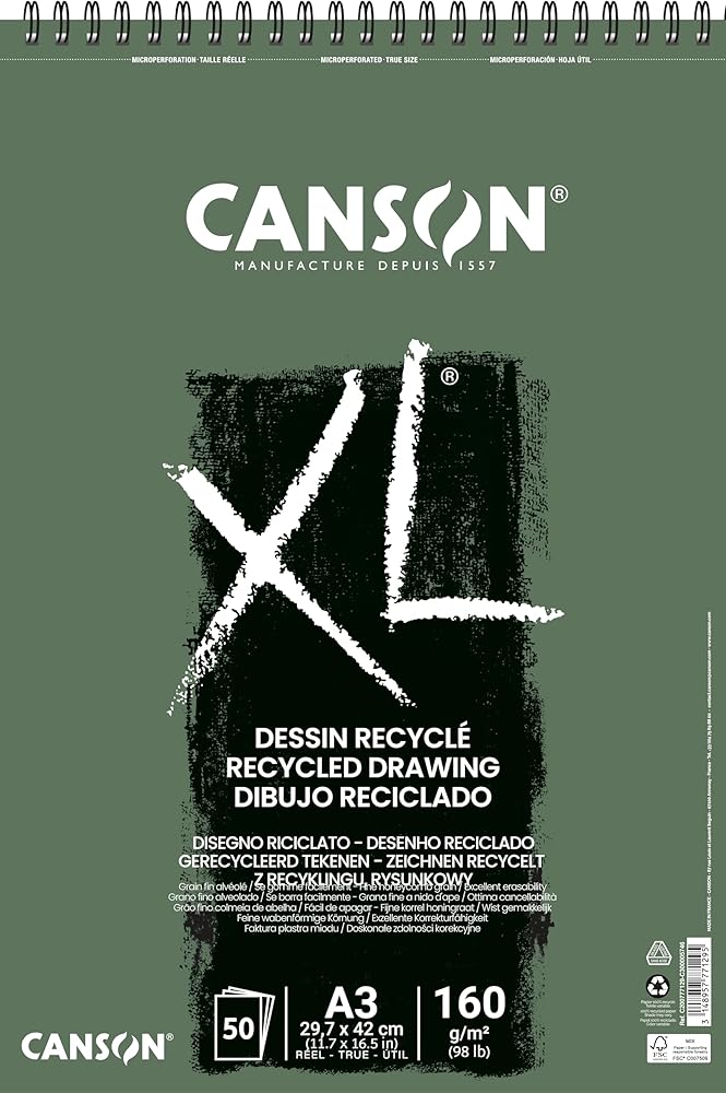 Genuine drawing paper, made from 100% recycled paper, XL Recycled Drawing withstands erasing and scraping, and will not flake. Its light, finely honeycombed grain, has plenty of scope for material effects. For use with pencil, lead pencil, charcoal, sanguine ink, pen and gouache. This is the paper for environmentally conscious artist.