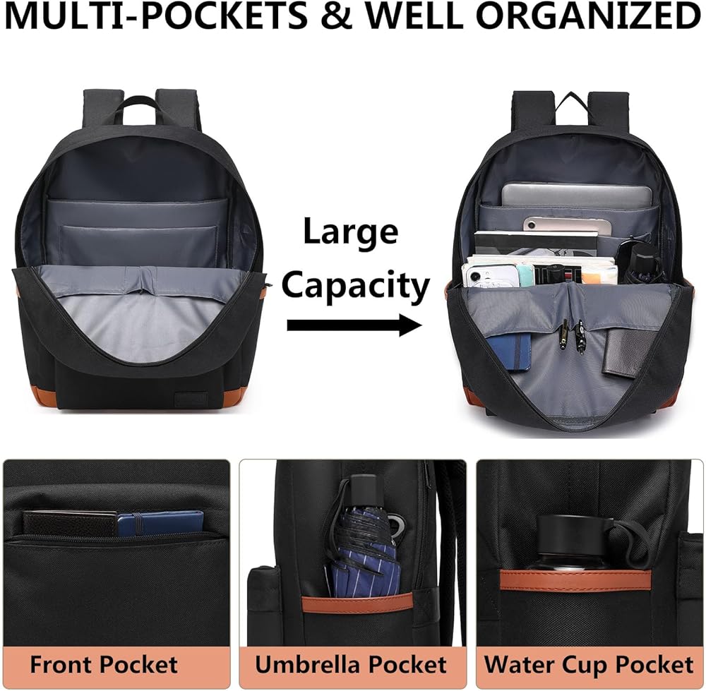 LOTS OF STORAGE - This classical black laptop backpack has 2 separate laptop compartments which can hold 15.6 inch laptop and 9.7 inch ipad. 1 main packing room is spacious for storing A4 folders, books, change of clothes and other daily necessities. 1 front pocket for your key, mouse, adapter, charging cord etc. 2 side pockets for water bottle and umbrella. keep your items organized and easier to find. Unisex backpack size: 16.9 x 12.9 x 5.5 inches. Weight: 1.38 pound