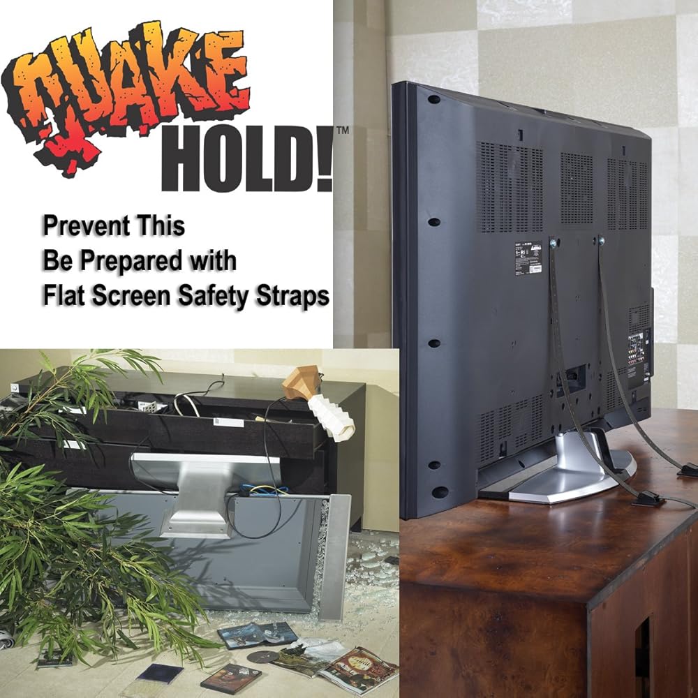 New to the range of QuakeHold! products is the Flat Screen TV Safety Strap. It has been developed to prevent modern LED, LCD and Plasma flat screen TVs from toppling over. This product is for use with the TV's existing rear bolt holes. It features two strong, coated nylon straps with locking buckles. Each strap must be screwed into the mounting plate on the back of the TV. Lock straps into buckles, remove the plastic strips from the base of the buckles and press buckles on to the tabletop in the desired location. Straps are hidden from view. No holes have to be drilled and there's no damage to furniture or equipment. Secures large flat screen TVs from 40" to 70" and 150 lbs.