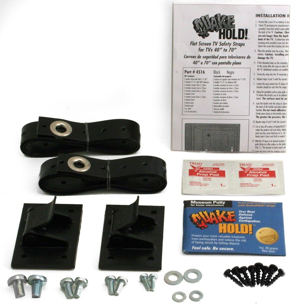 Developed to prevent modern LED, LCD, and Plasma flat screen TVs from toppling over. Use with the TVs existing rear bolt holes. Features 2 strong coated nylon straps with locking buckles. Each strap must be screwed into the mounting plate on the back of the TV. Lock straps into buckles, remove the plastic strips from the base of the buckles, and Press buckles onto the tabletop in the desired location. Straps are hidden from view. No holes have to be drilled, and No damage to furniture or equipment. The product is manufactured in United states.