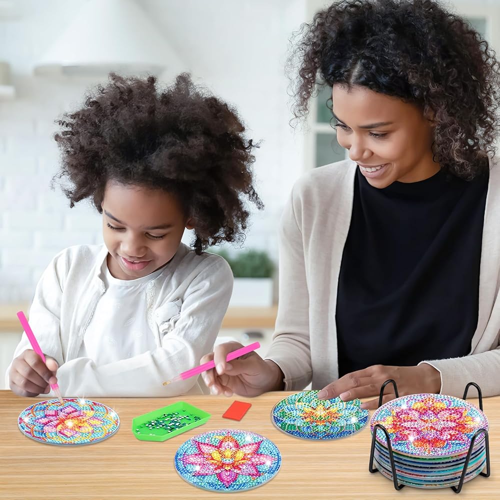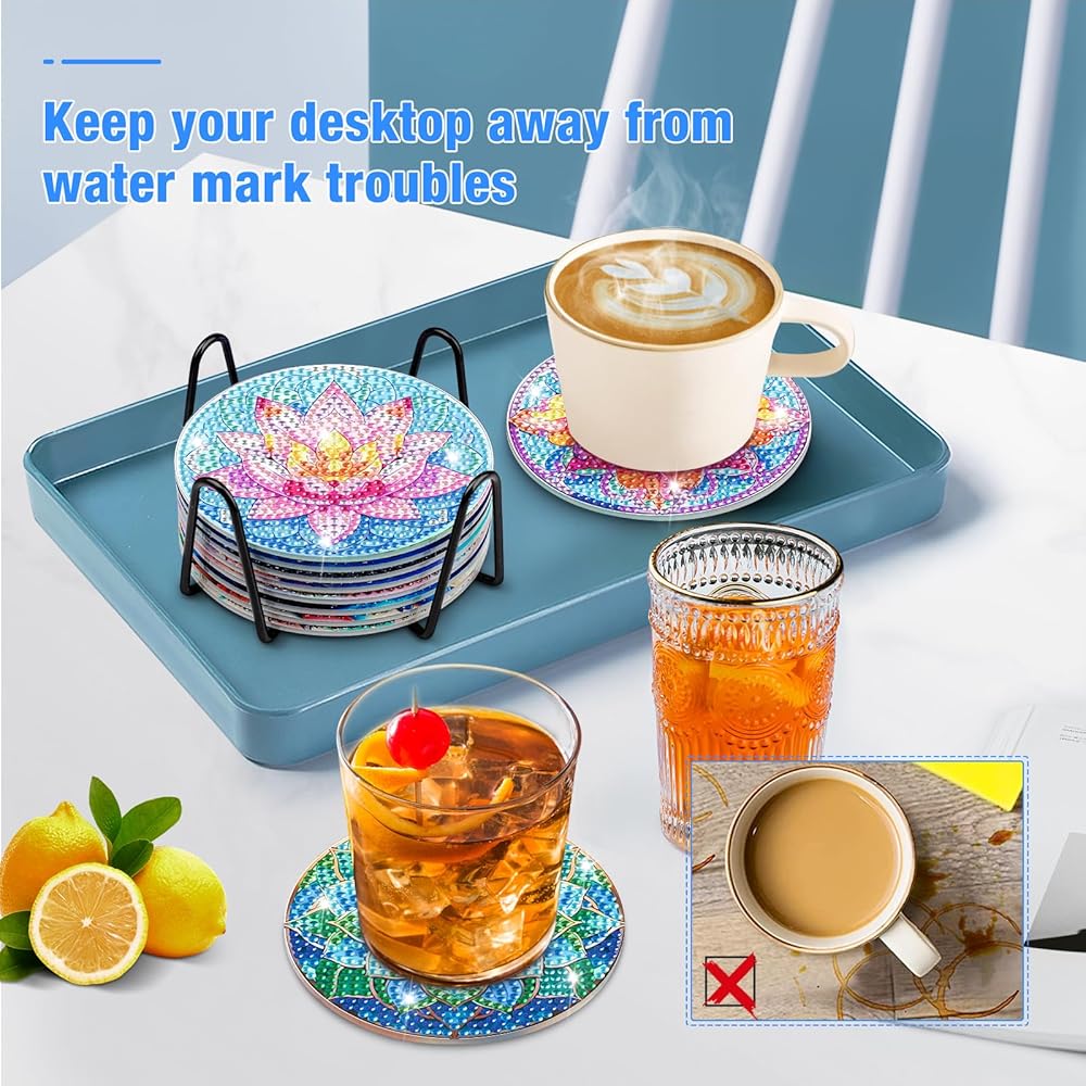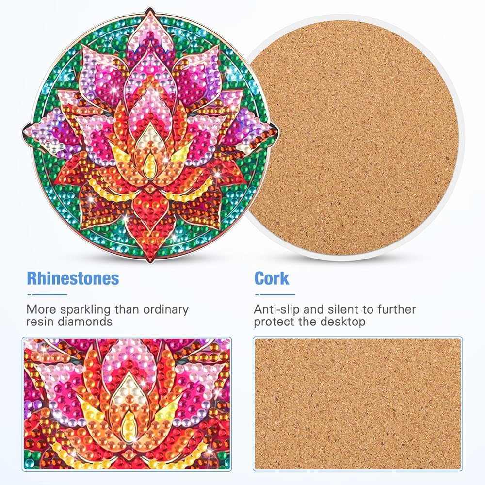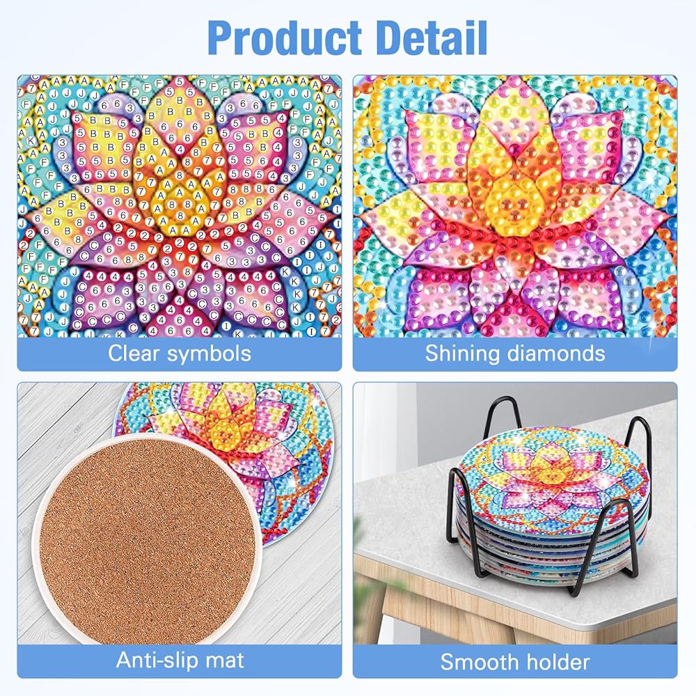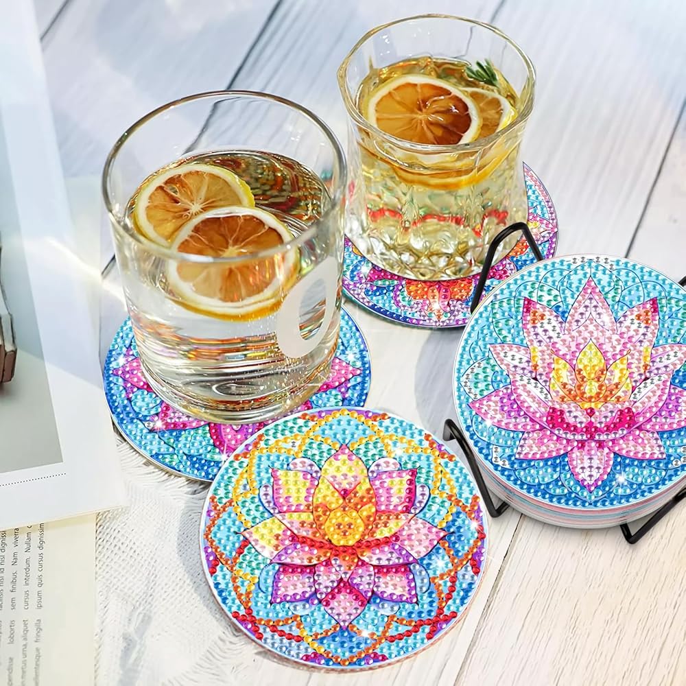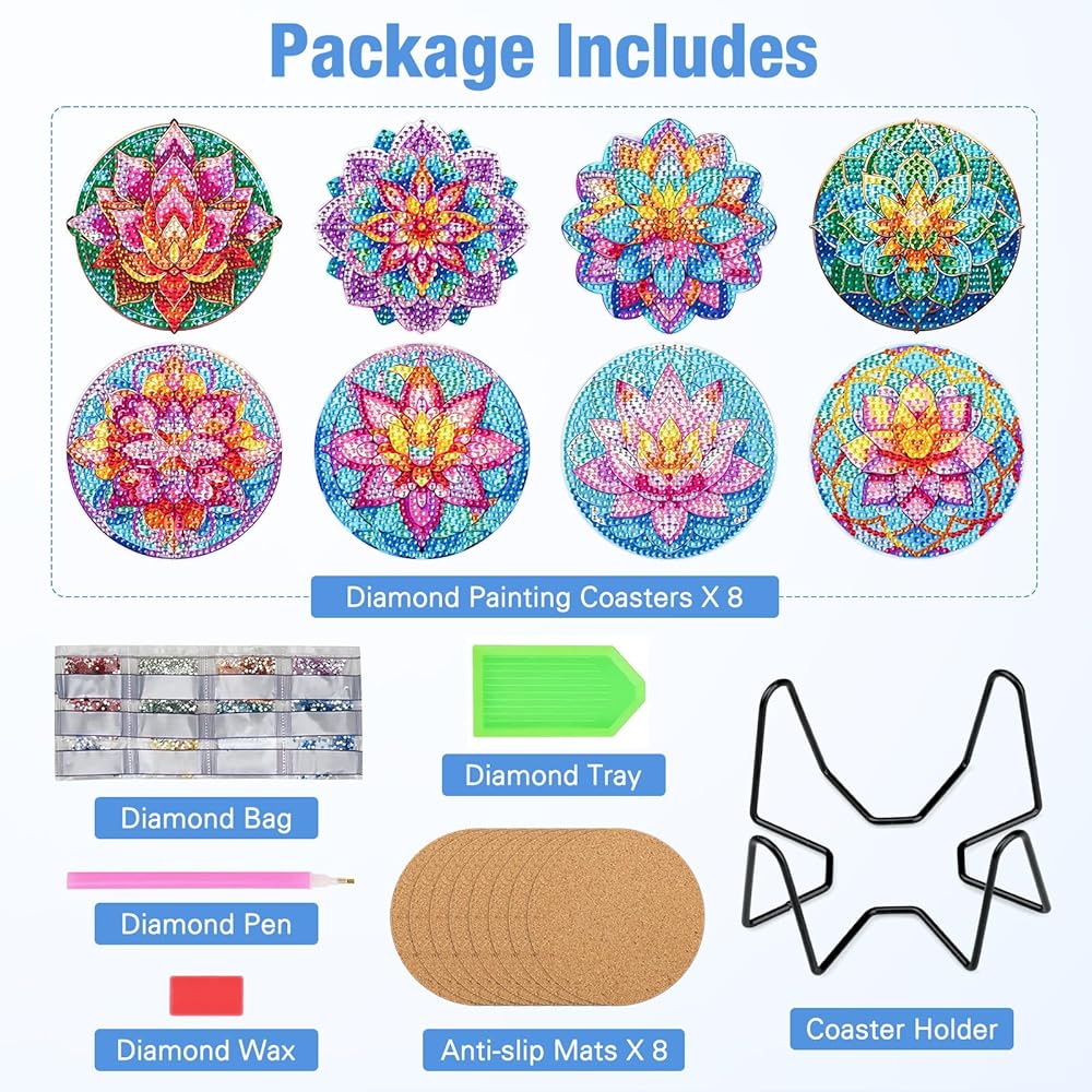 AIRDEA 8 Pcs Diamond Art Painting Coasters with Holder, DIY Flowers Coasters Diamond Art Painting Coaster Kits for Beginners Adults,Lotus Diamond Art Coasters Drinks Coaster,4 inch