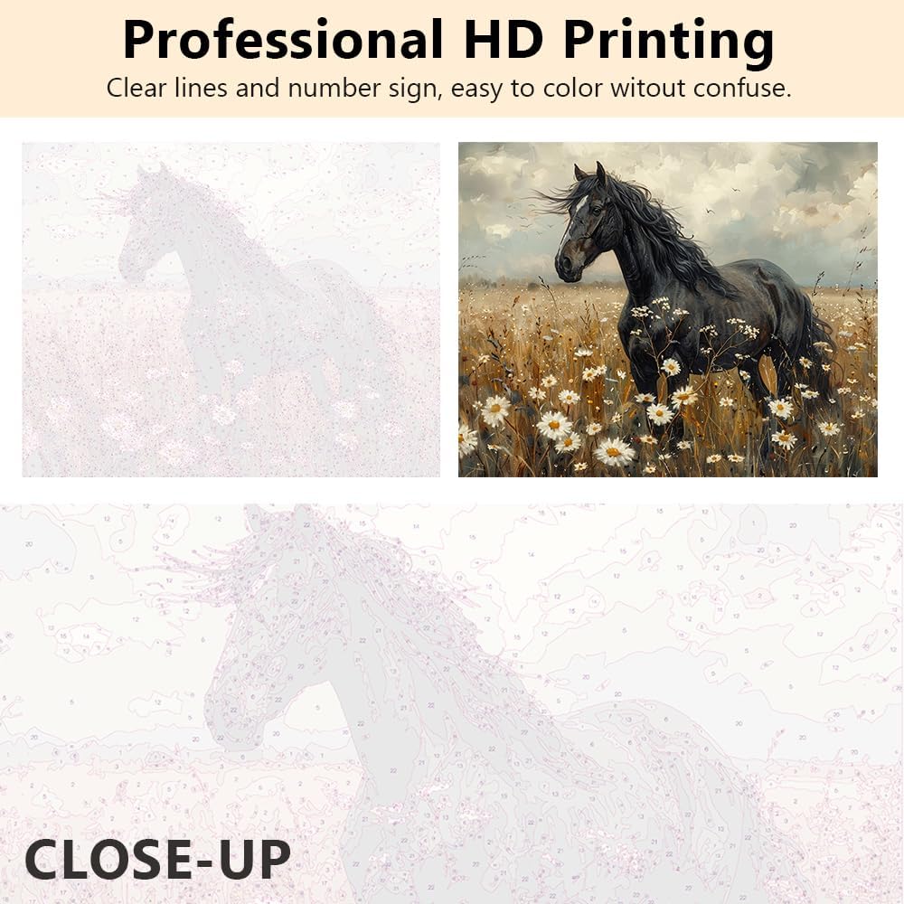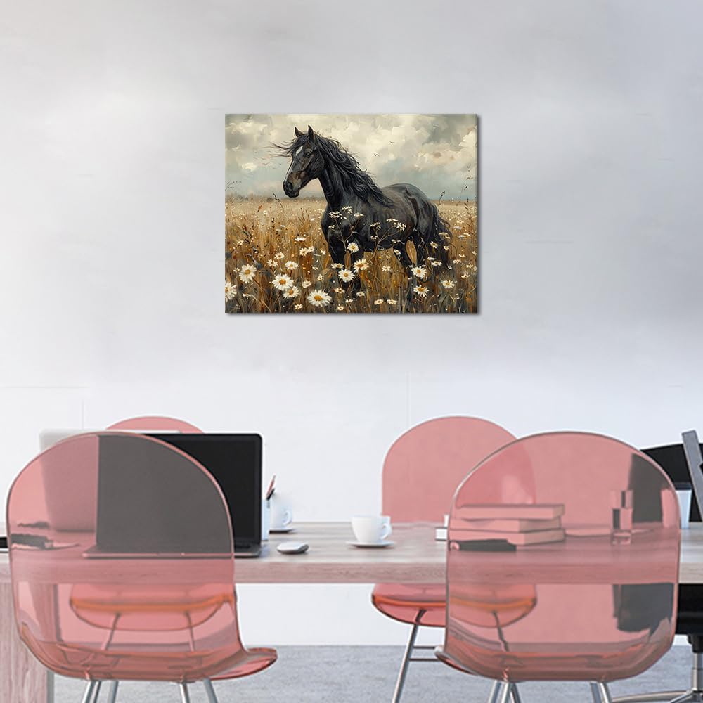TUMOVO Animal Paint by Numbers for Adults Vintage Nostalgic Black Horse in White Flower Field Adults' Paint-by-Number Kits Paint by Number Kits On Canvas for Wall Decor, 16x20 Inch