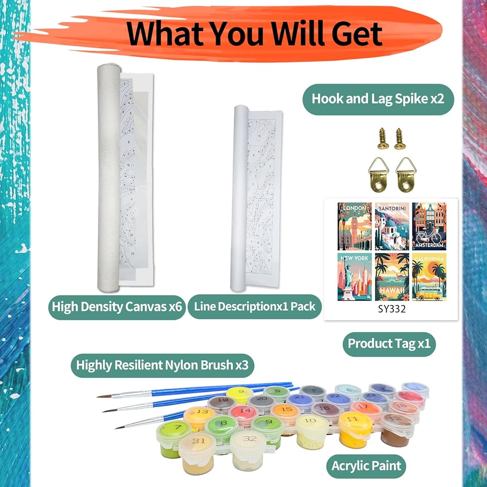 WHAT WILL YOU GET: You will receive a paint by number kit including HD Pre-printed canvas x 1, different sies brushes x 3, acrylic paint set x 1, hook x 2, providing you with everything you need to paint.