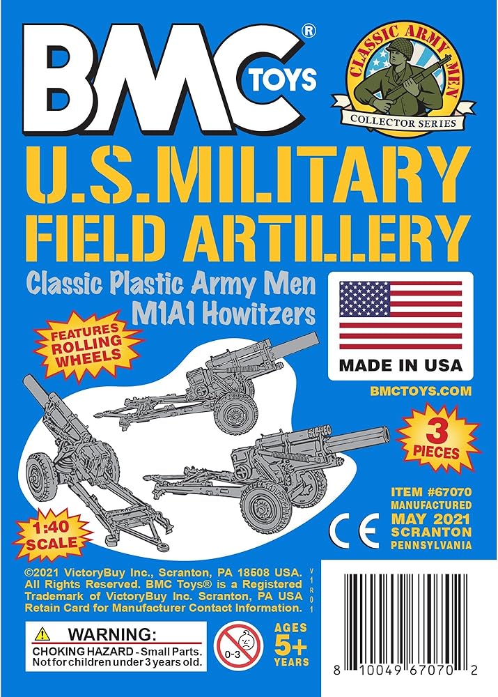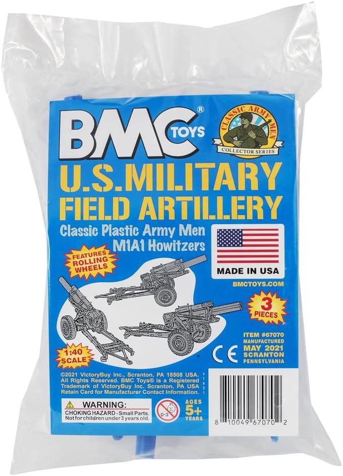 From the CLASSIC ARMY MEN COLLECTOR SERIES, BMC Toys brings back another toy from the Golden Age of Plastic Army Men. This field artillery set includes 3 Long-barrel Howitzers. Each gun measures 7.25 x 2.25 x 2.8 inches tall and has a a lot of detail with a little bit of flashing. Made from Tan color stiff HIPS plastic and feature rolling wheels.